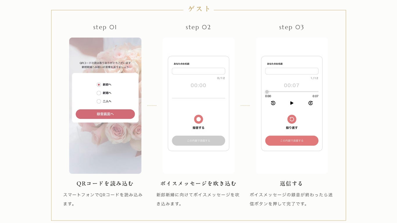 結婚式当日にQRコードでゲストからボイスメッセージを集め「声の花束」をつくれる最新サービスです。