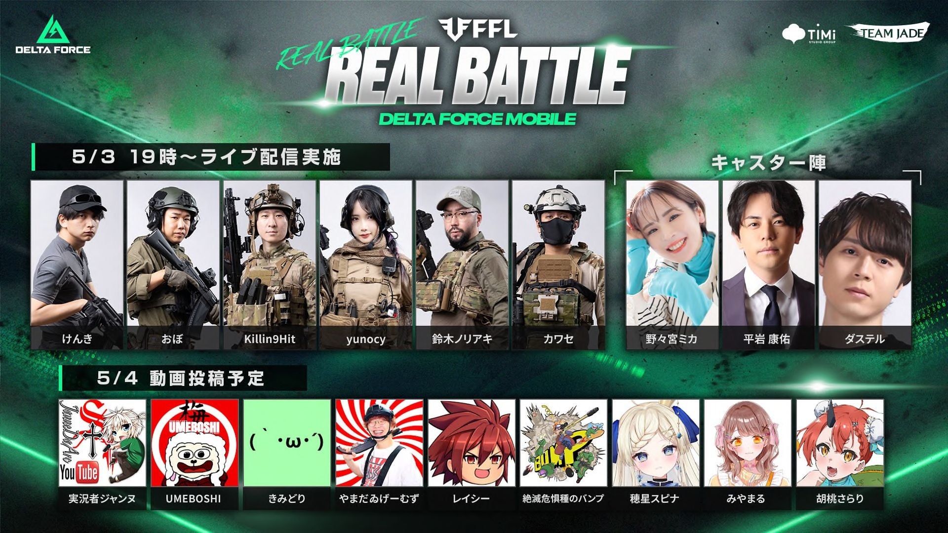 5月3日(土)の夜、けんき、おぼ、Killin9Hit、yunocy、鈴木ノリアキ、カワセといった豪華ストリーマーが集結し、事前に収録したサバゲー対戦を配信しながら、『Delta Force』モバイル版の激戦を繰り広げます。見逃せない熱狂の夜になること間違いなし!ストリーマーたちの巧みな連携と個々のスキルがぶつかり合い、どのようなドラマが生まれるのか注目です!