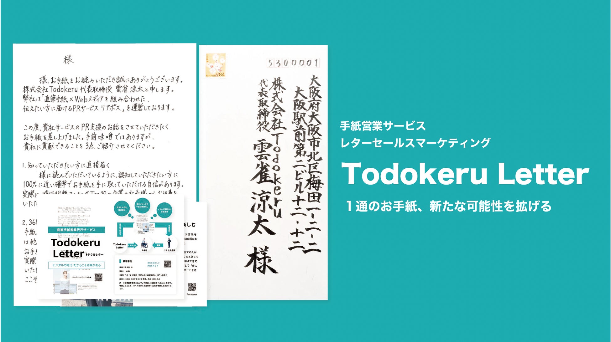 Todokeru Letterは、デジタルの時代だからこそ1通の直筆手紙を活用しこれまでアプローチが難しった経営層の方々に対し直接営業を行う営業代行サービスです。