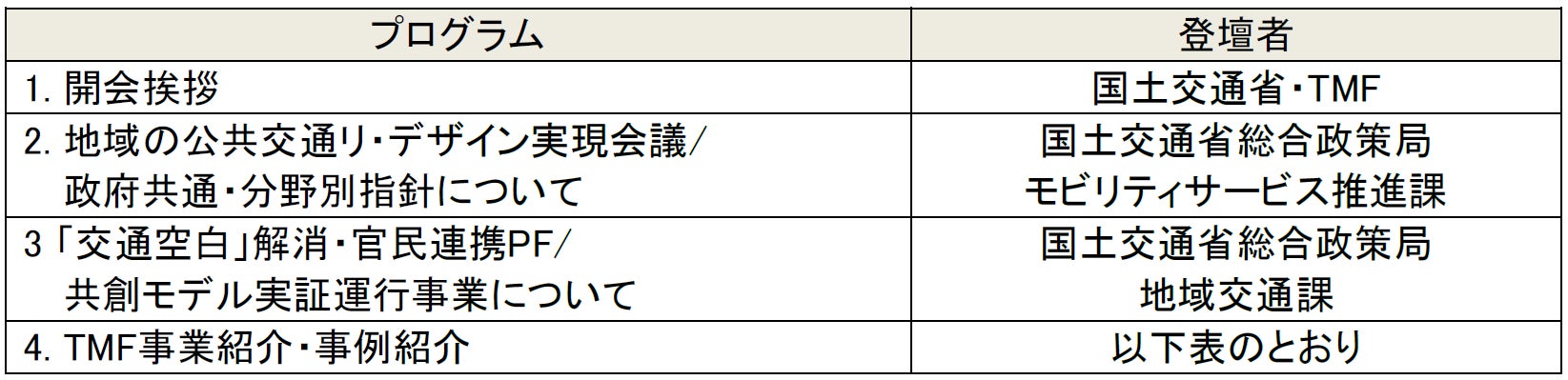 4回目となる今回のシンポジウムでは、TMFの継続的な支援の取り組みが、国土交通省の「共創モデル実証運行事業」として認められたことを踏まえ、TMFの事業や各地の事例を紹介するとともに、国土交通省が設置した「地域の公共交通リ・デザイン実現会議」や、 「『交通空白』解消本部」における取り組みも、同省より説明いただく予定です。