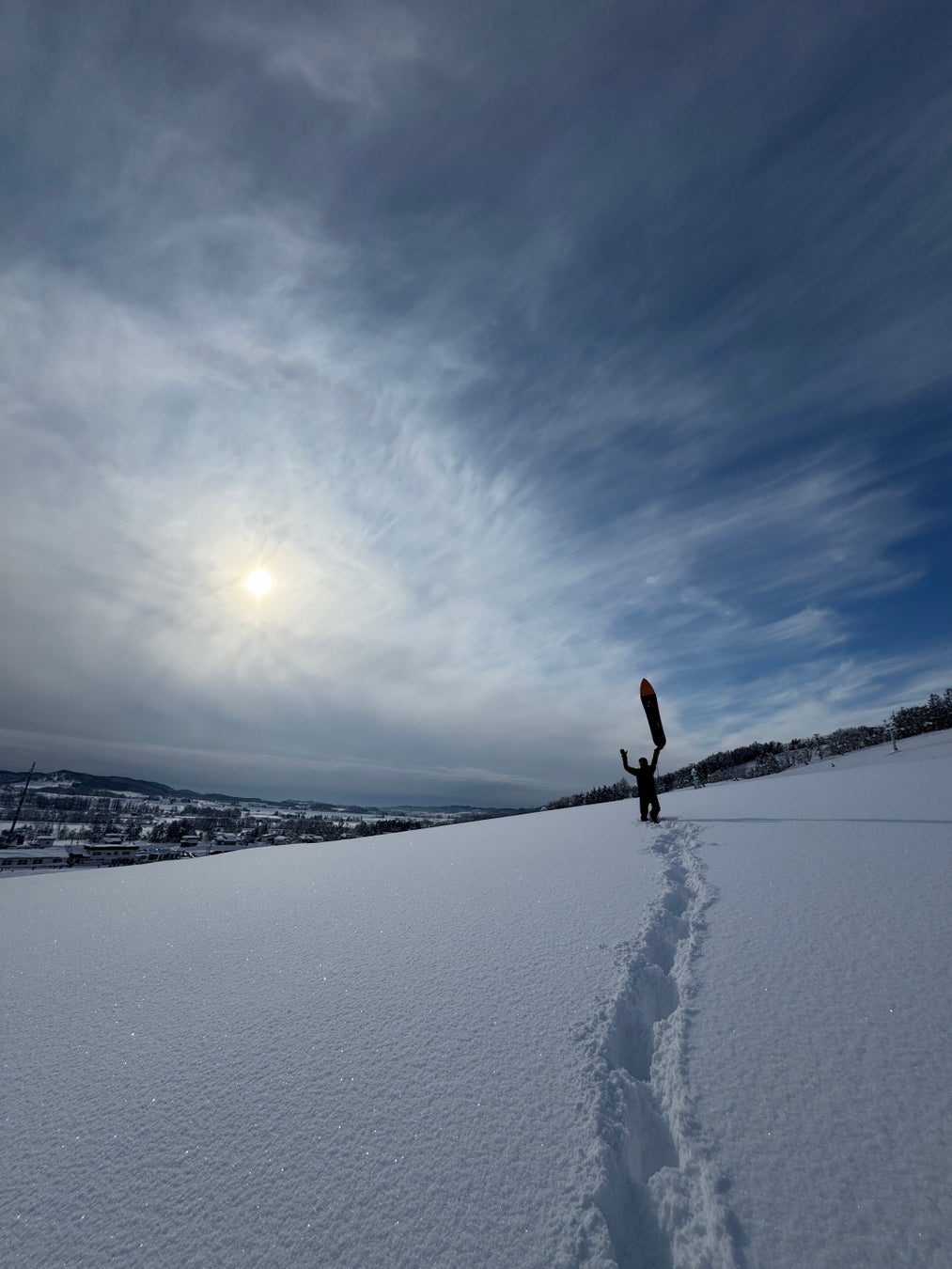 スノーボードの装備、エッジ、ソール材、ビンディング、ブーツを付けず、板に直乗りして雪山を滑る冬玩具です。