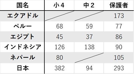 ・ 一部の国では対象学年の前後を含みますが、本報告書内では便宜上「小4」「中2」と表記します。(ペルー:小4~5相当、エジプト:小3~小5相当)