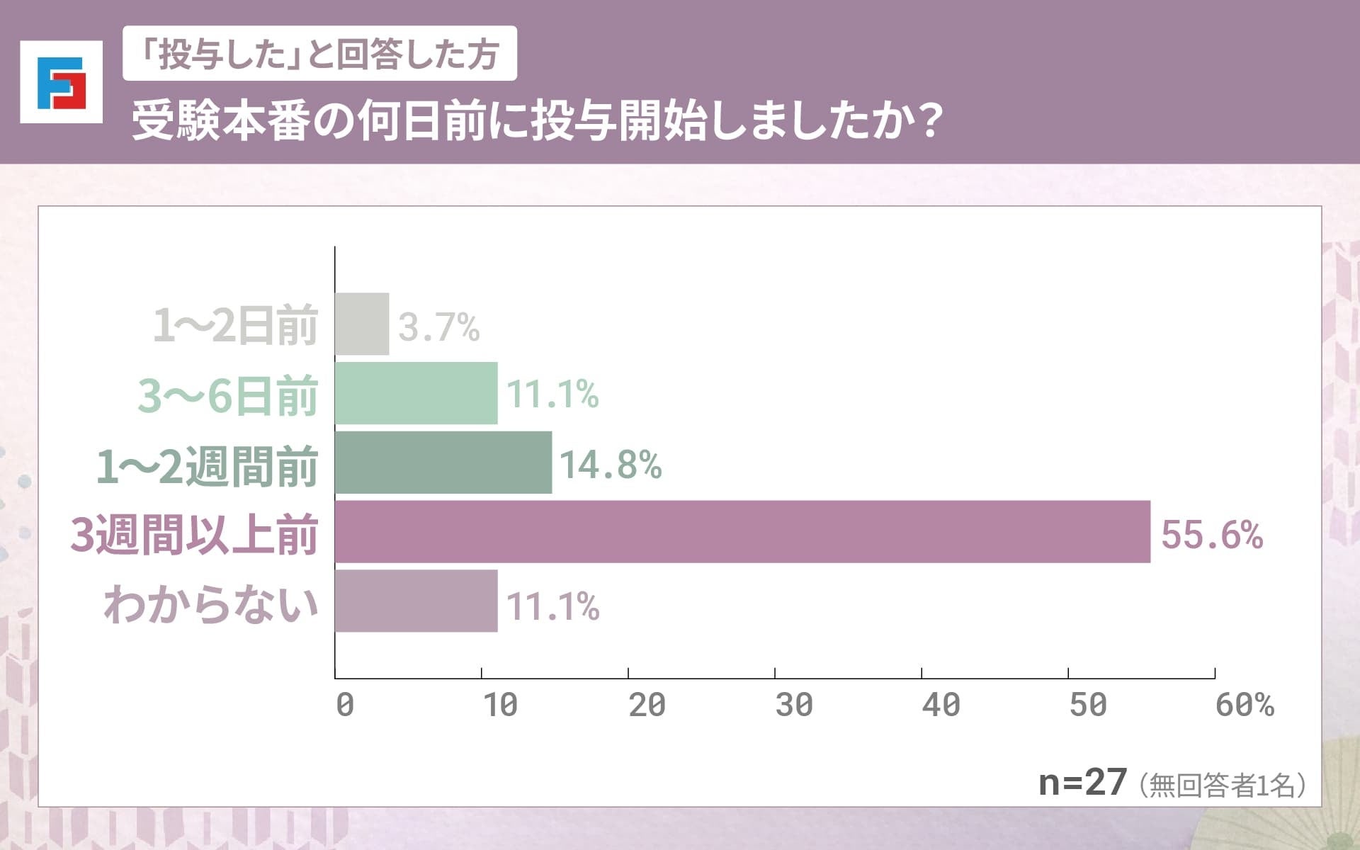 予防投与の開始時期は、「3週間以上前(55.6%)」が最も多く、次いで「1〜2週間前(14.8%)」「3〜6日前(11.1%)」「1〜2日前(3.7%)」で、「わからない(11.1%)」も一定数見られました。