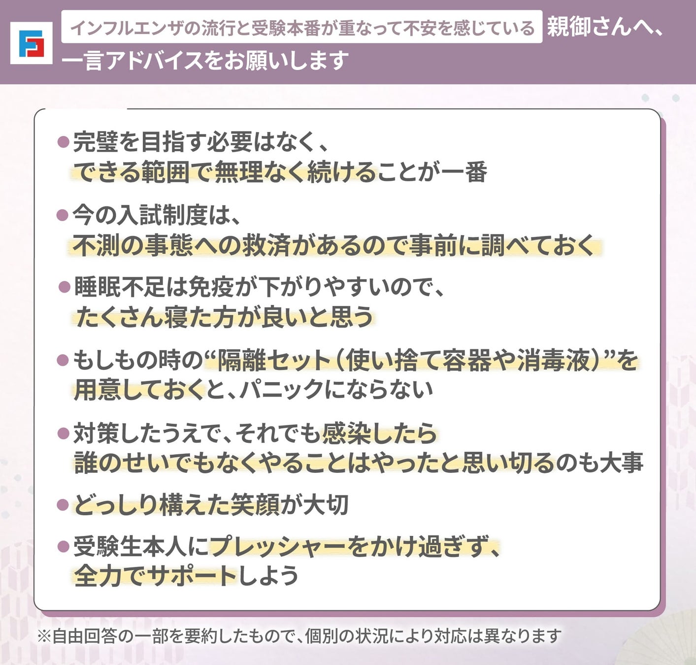 インフルエンザの流行と受験本番が重なり不安を感じている親御さんに向けて、自由回答でアドバイスを募りました。