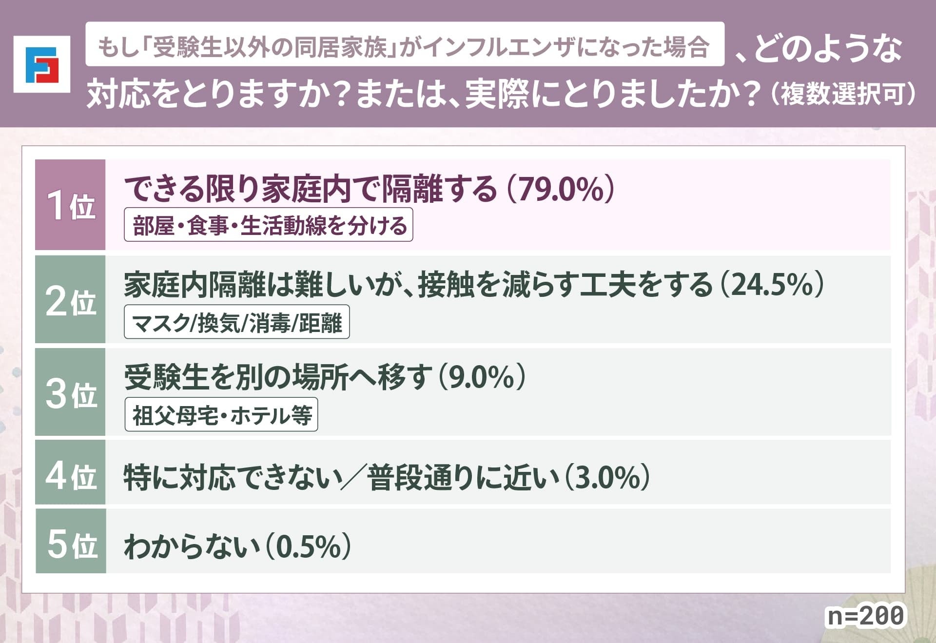 この結果から、受験期は「家庭内に持ち込まれた後の広がり」をいかに抑えるかが強く意識されており、受験生を守るために、同居家族が感染した場合でも“まず隔離”を優先する家庭が多いことがわかります。