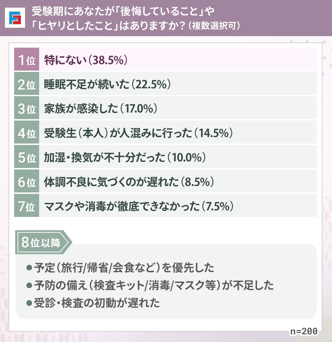 受験期に「後悔したこと/ヒヤリとしたこと」を尋ねたところ、最多は「特にない(38.5%)」で、次いで「睡眠不足が続いた(22.5%)」「家族が感染した(17.0%)」が続きました。