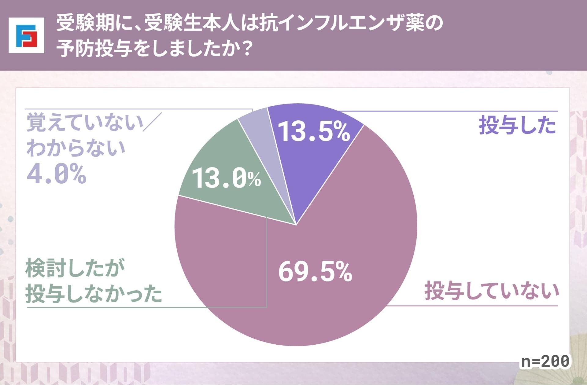受験期に受験生本人が予防投与を行ったか尋ねたところ、最多は「投与していない(69.5%)」、次いで「投与した(13.5%)」「検討したが投与しなかった(13.0%)」「覚えていない/わからない(4.0%)」と続きました。