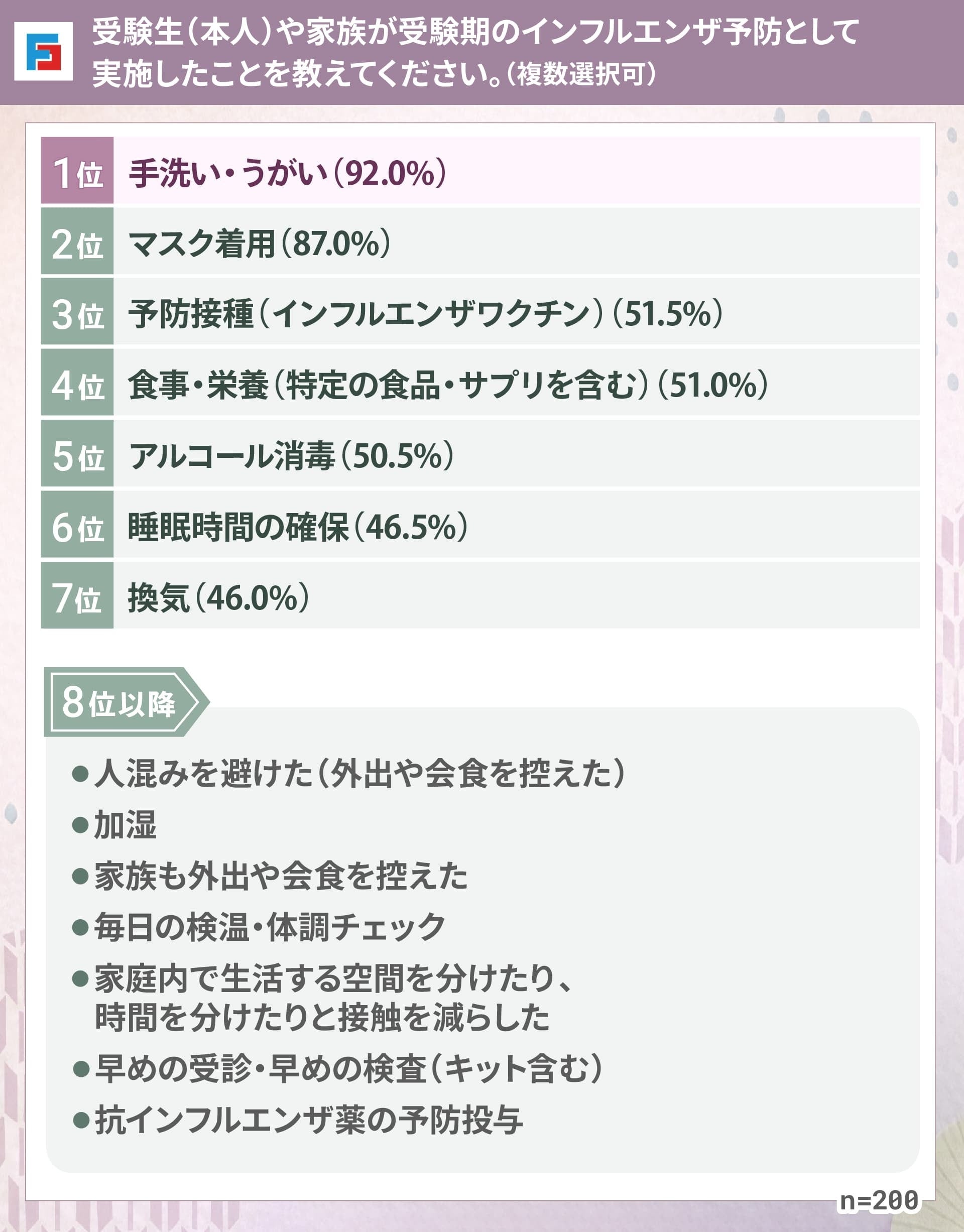 この結果から、受験生家庭の対策は「手洗い・マスク」といった基本行動を軸に、ワクチンや生活習慣の改善を組み合わせる形が主流であることがわかります。