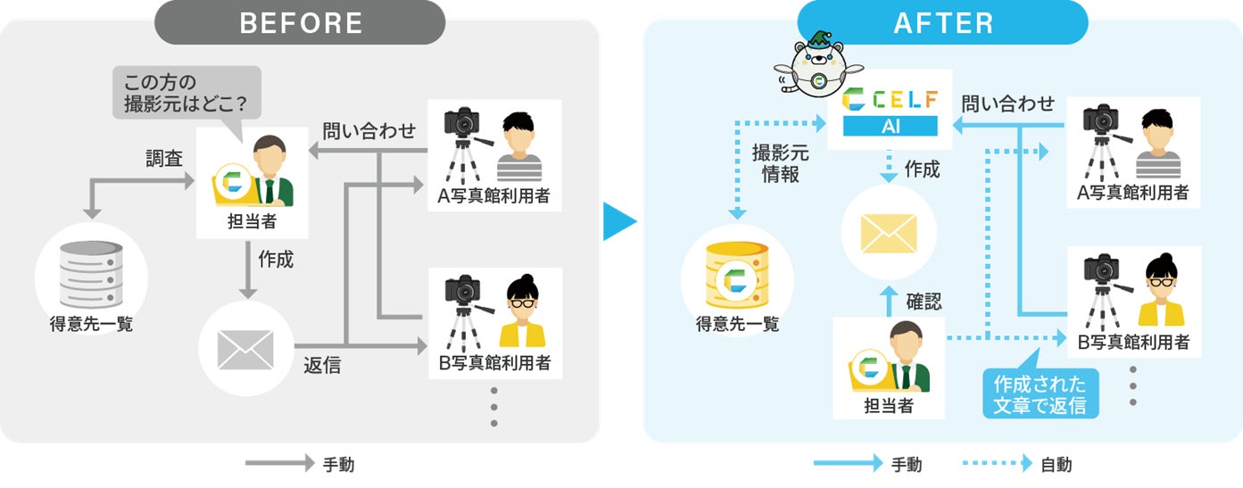 しかし、写真を受け取ったお客様から「撮影内容の確認」「閲覧期限後の再閲覧依頼」など問い合わせが多く、撮影元の写真館でなければ対応ができないため、案内業務に多くの工数がかかっていました。そこで、CELF AIのRAG 技術を活用し、「得意先一覧」「問い合わせ履歴」などのデータからお客様の撮影元写真館を特定し、連絡先を自動抽出。過去の対応履歴を参考に、案内文・回答文を自動生成する仕組みを構築することで、月10 時間の作業時間削減を実現しました。