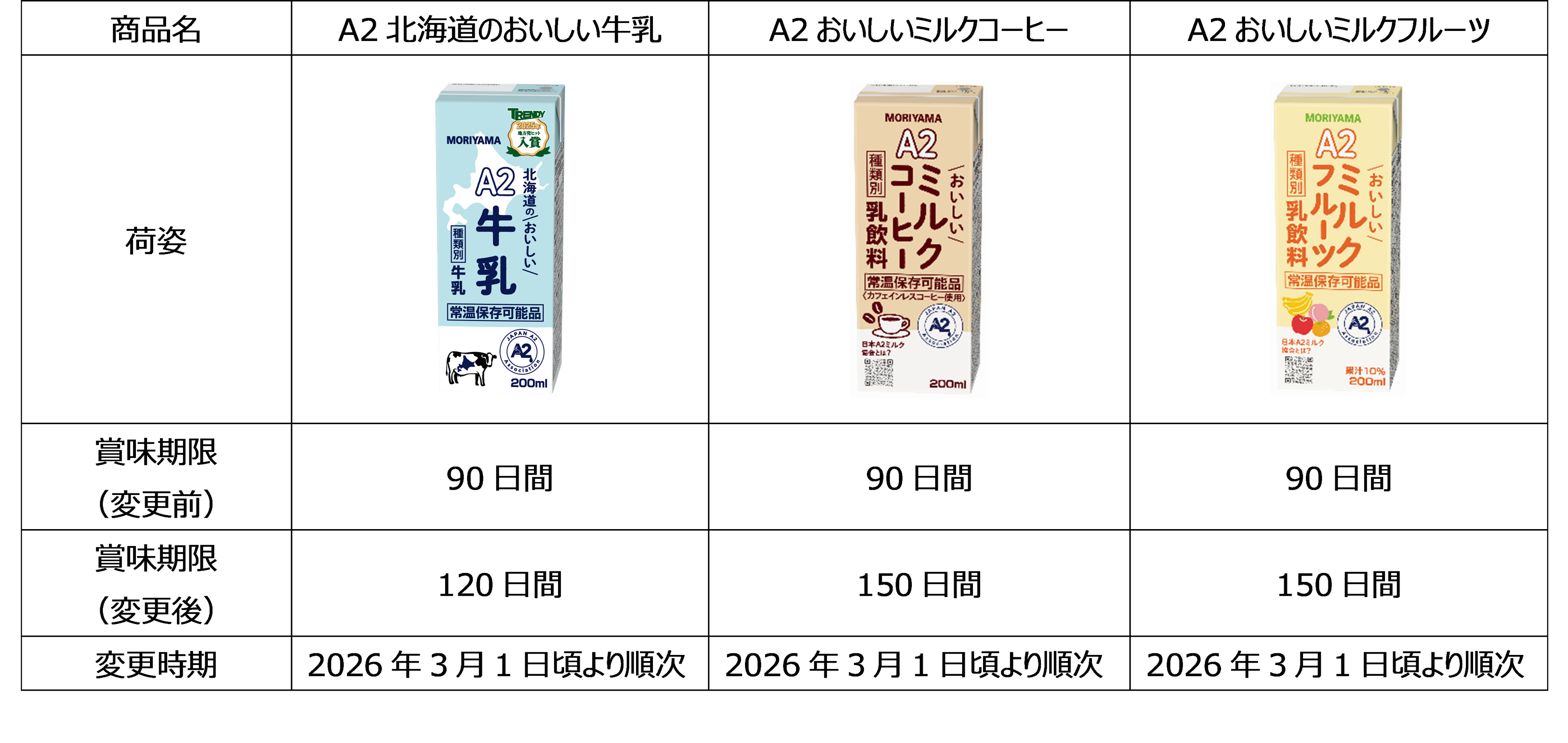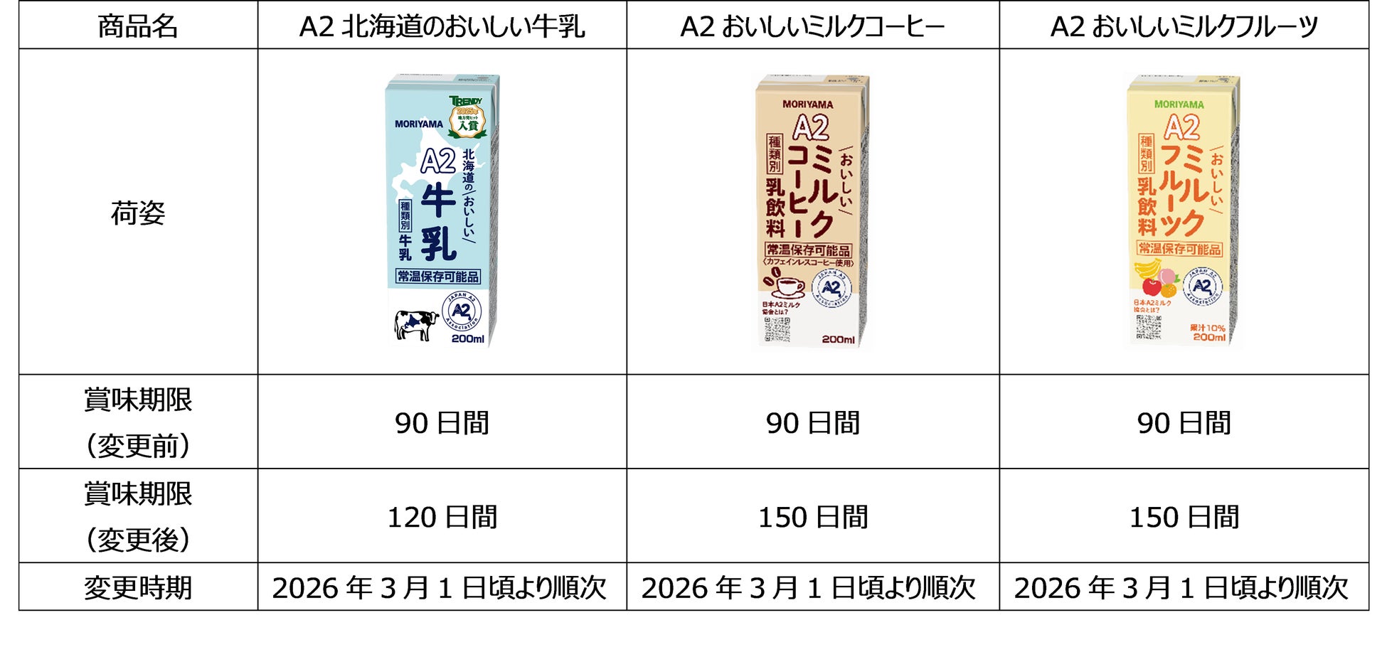 同時に、同シリーズの「A2おいしいミルクコーヒー」「A2おいしいミルクフルーツ」は賞味期限を90日から150日に延長いたします。
