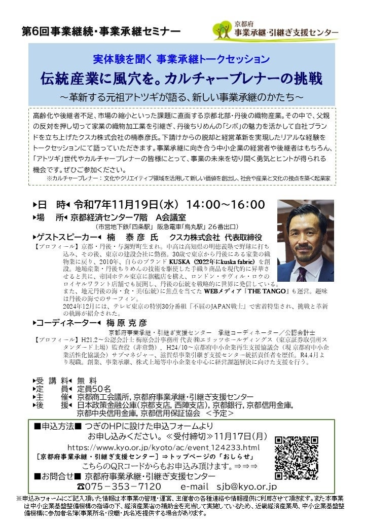 本件に関する問い合わせ: 京都府事業承継・引継ぎ支援センター(担当:梅原)