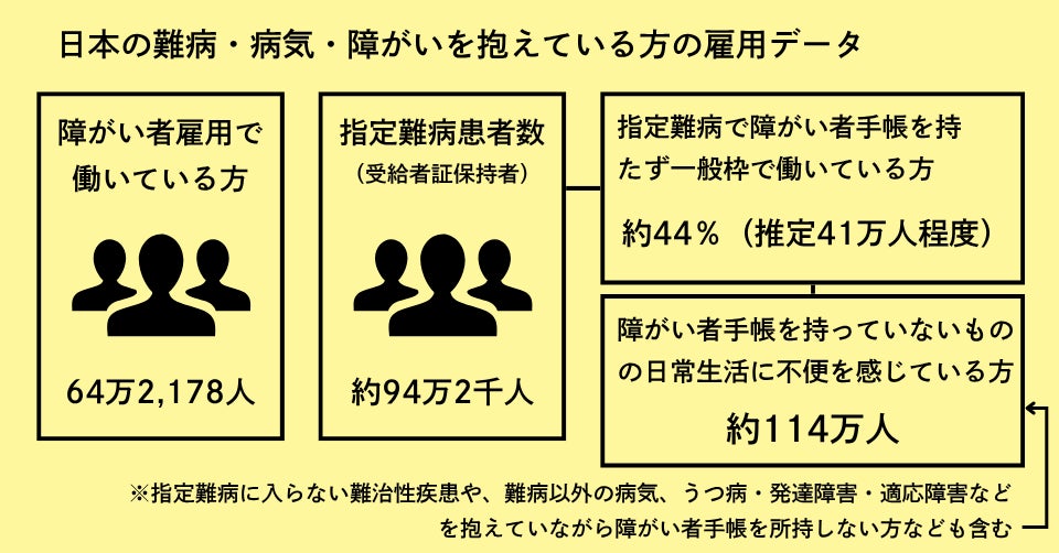 さらに、指定難病に入らない難治性疾患や、うつ病・発達障害・適応障害などを抱えていながら障がい者手帳を所持しない方などを含めると、障がい者手帳を持っていないものの、日常生活に不便を感じている方は約114万人いると言われています。(厚生労働省「令和4年生活のしづらさなどに関する調査」参照)