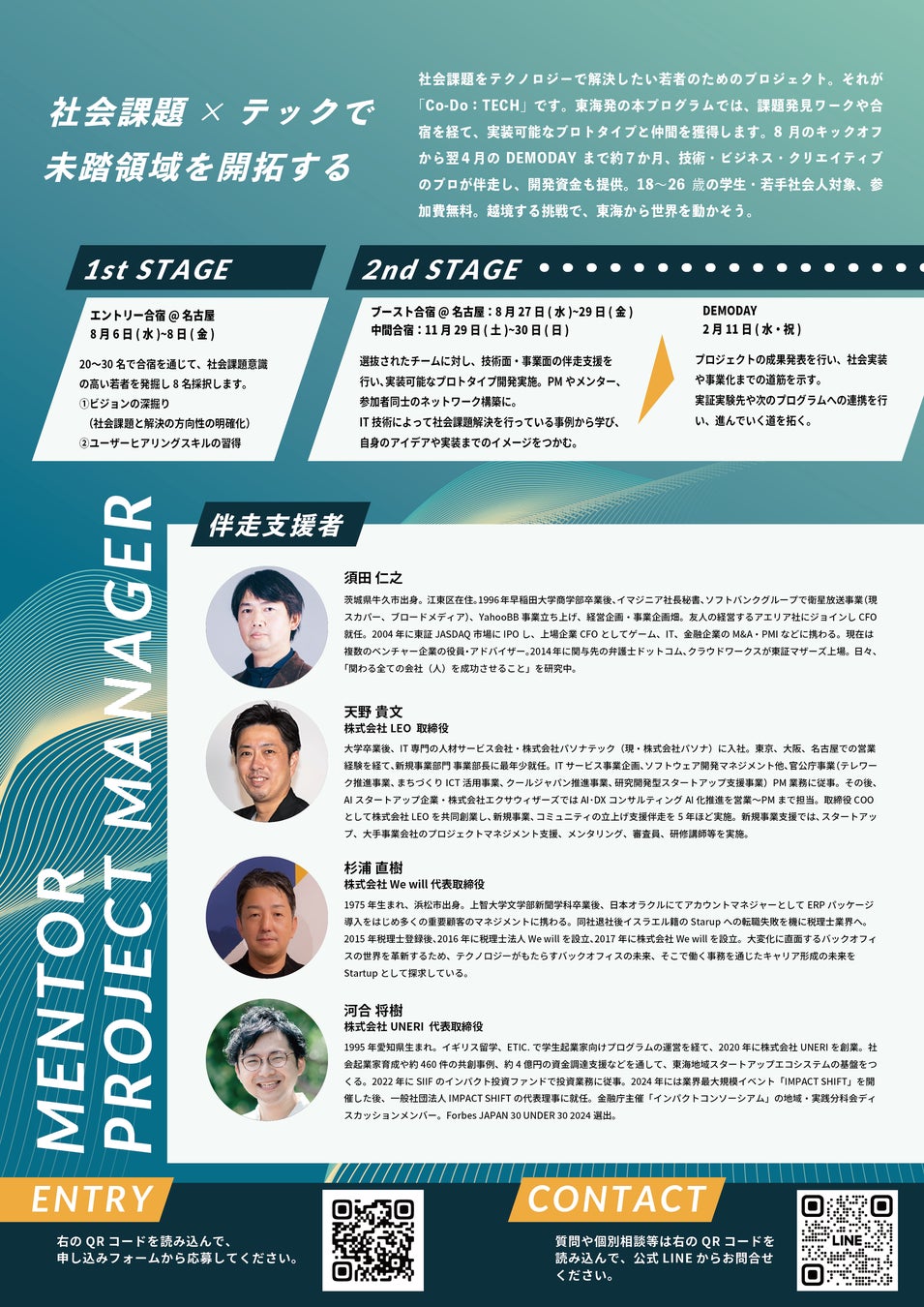 企画・運営は、若者の社会課題挑戦を支えてきた「Co-Do」チーム。中心メンバーは、株式会社レジスタ取締役・河尻諭と、一般社団法人OWN WAY代表理事・杉山真之介。これまで東海地域で数多くの若者支援に取り組んできた2人が、「地方にいても、誰かの模倣ではない“未踏の挑戦”はできる」という想いのもと、地域の大学・企業・行政と連携してプログラムを展開します。
