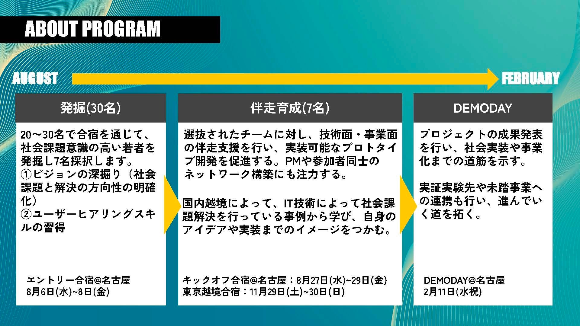 ここでの半年間は、あなたの人生を変えるかもしれません。そして、あなたの挑戦が、誰かの希望になるかもしれません。社会課題の現場で汗をかき、テクノロジーで突破口を開き、仲間とともに未来をつくるあなたの参加を、心からお待ちしています。