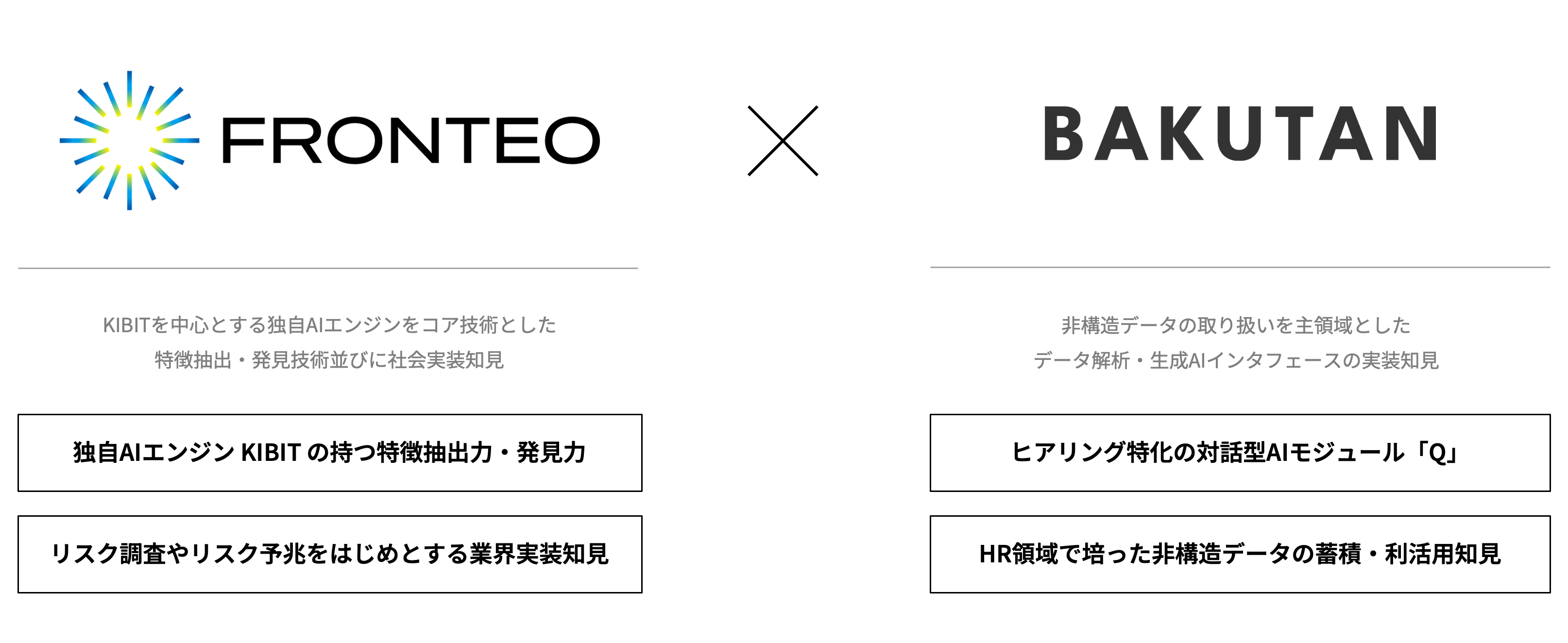 FRONTEOと東京大学松尾研発スタートアップ BAKUTAN、FRONTEO AI「KIBIT」とBAKUTANのヒアリングAI「Q」を融合した「新たなAIソリューションの共同開発・先行実証」を開始
