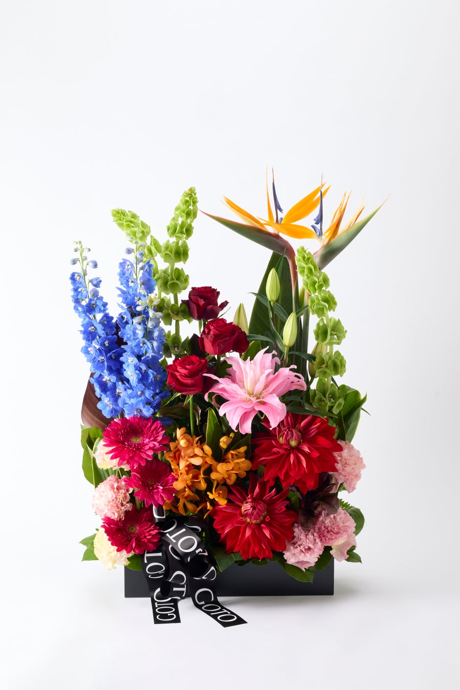 色鮮やかな花々を贅沢に束ね、咲き誇る美しさと圧倒的な華やかさを表現。豊かな彩りと伸びやかなフォルムが、空間に上質な存在感をもたらします。フォーマルな贈答や特別な記念日など、印象を強く残したいシーンに最適な一品です。