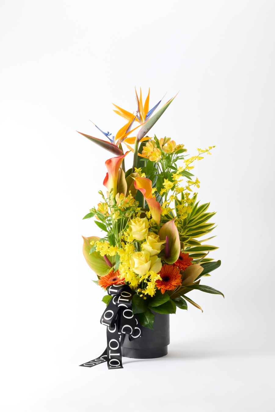 陽光を思わせるイエローやオレンジの花々が、明るく洗練された印象を演出。立体的な構成と伸びやかなラインが、空間にダイナミズムをもたらします。開店祝いやビジネスシーンなど、ポジティブなメッセージを伝えるギフトとしておすすめです。