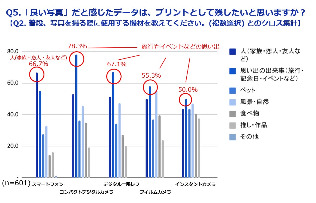 使用する撮影機材別に「プリントとして残したい写真の種類」を分析すると、どの機材においても「人」や「思い出」が上位に挙がる結果となりました。