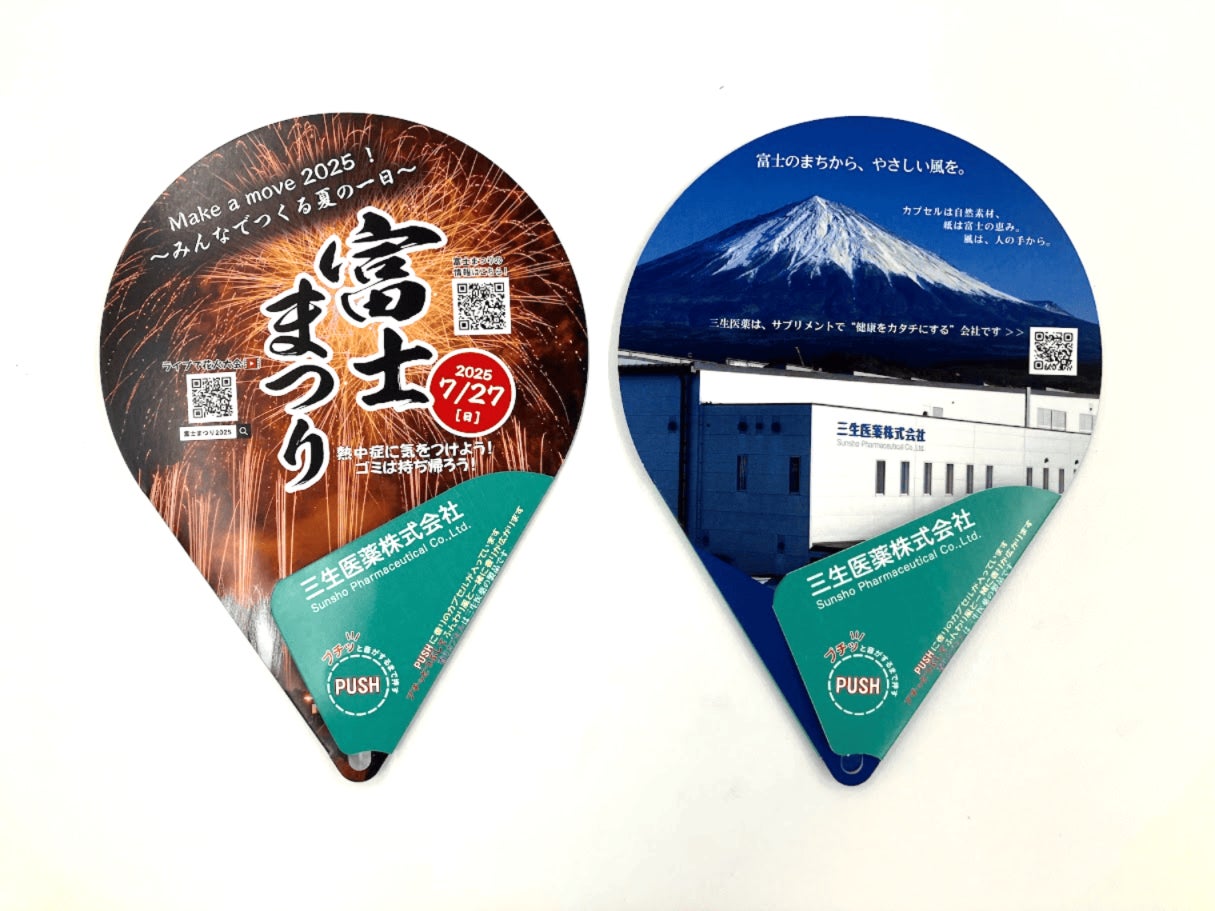 2025年7月27日(日)に静岡県富士市で開催される「富士まつり2025」において、三生医薬株式会社(本社:静岡県富士市、代表取締役社長:今村 朗)は、長年培ってきたカプセル製剤技術を応用した「香るカプセル」搭載の紙製ウチワを、協賛企業として2,800枚限定で配布いたします。