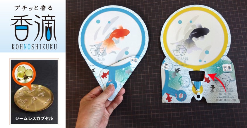 このウチワは、有限会社髙田紙器製作所(東京都葛飾区/代表取締役社長:髙田 照和)が、『東京TASKものづくりアワード2024』で優秀賞を受賞したウチワ「紙滴」の構造をさらに発展させた「香滴(こうのしずく)」です。返し部分の内側に組み込まれたカプセルの香りが、あおぐ人に確実に届くよう設計されているだけでなく、紙を折りたたむだけでカプセルを固定できる独自構造により、接着剤や余分な部材を使わずに組み立てられます。こうした工夫により、環境負荷を抑えながら、コスト面にもやさしいスマートな香り体験が実現しました。