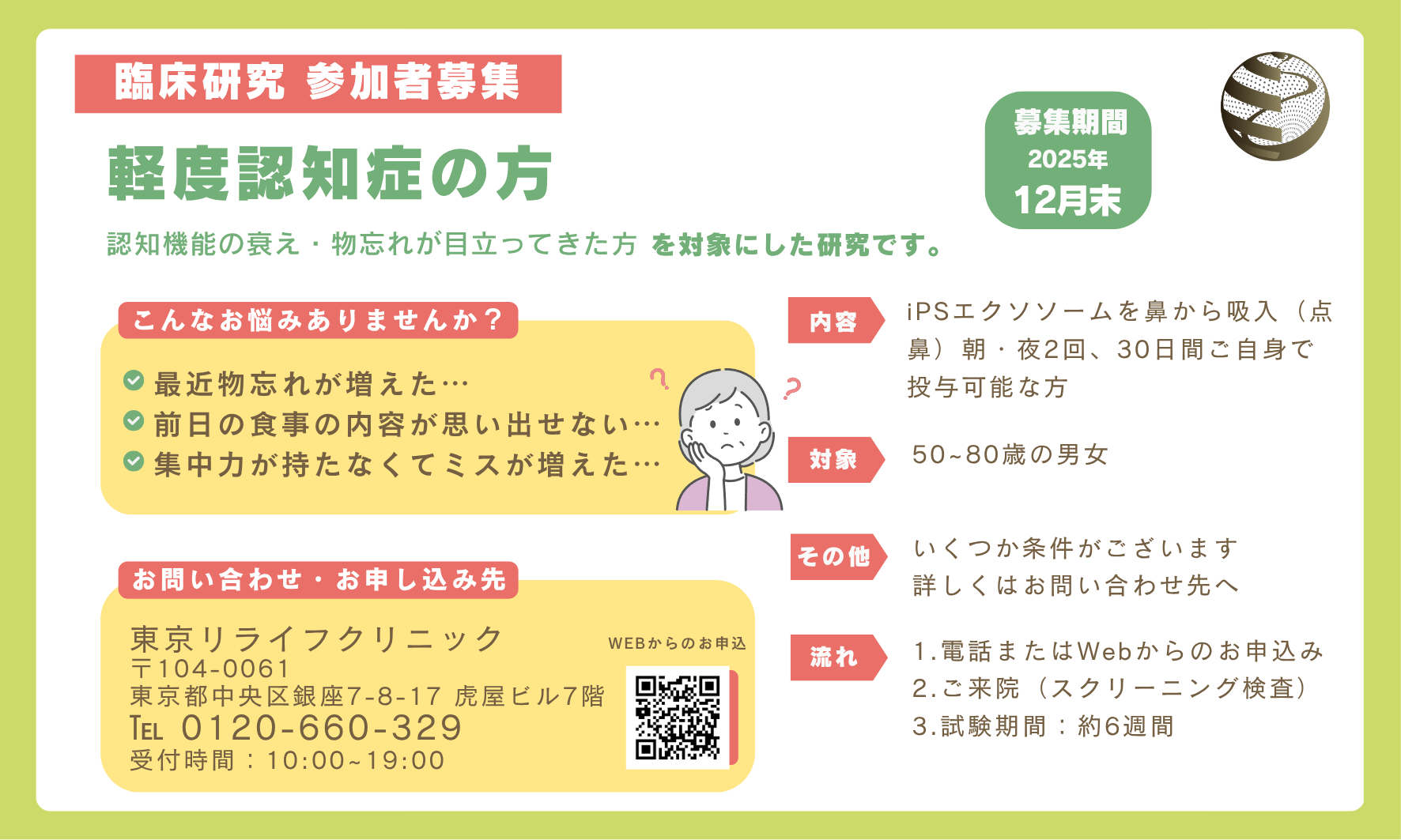 MCI(軽度認知障害)を対象とした臨床研究 ― iPS細胞由来エクソソーム点鼻投与モニター参加者募集開始 ―