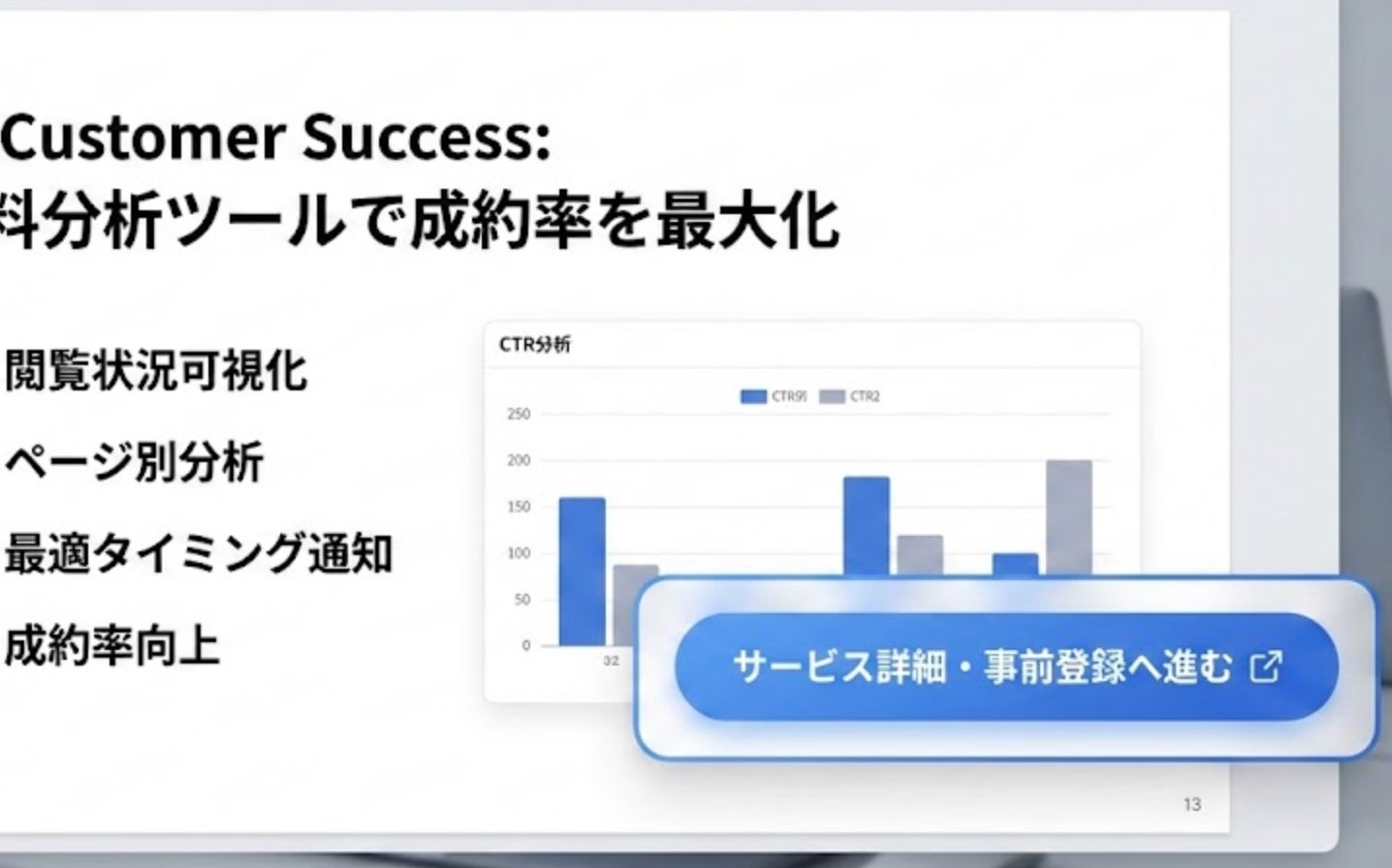 資料の閲覧状況を可視化する分析ツール。ページごとの滞在時間や離脱箇所、CTRを把握でき、共有リンクで「誰が熱心に読んでいるか」を特定可能。リアルタイムな反応を基に最適なタイミングでフォローできるため、成約率を向上させ、商材の売上を最大化。
