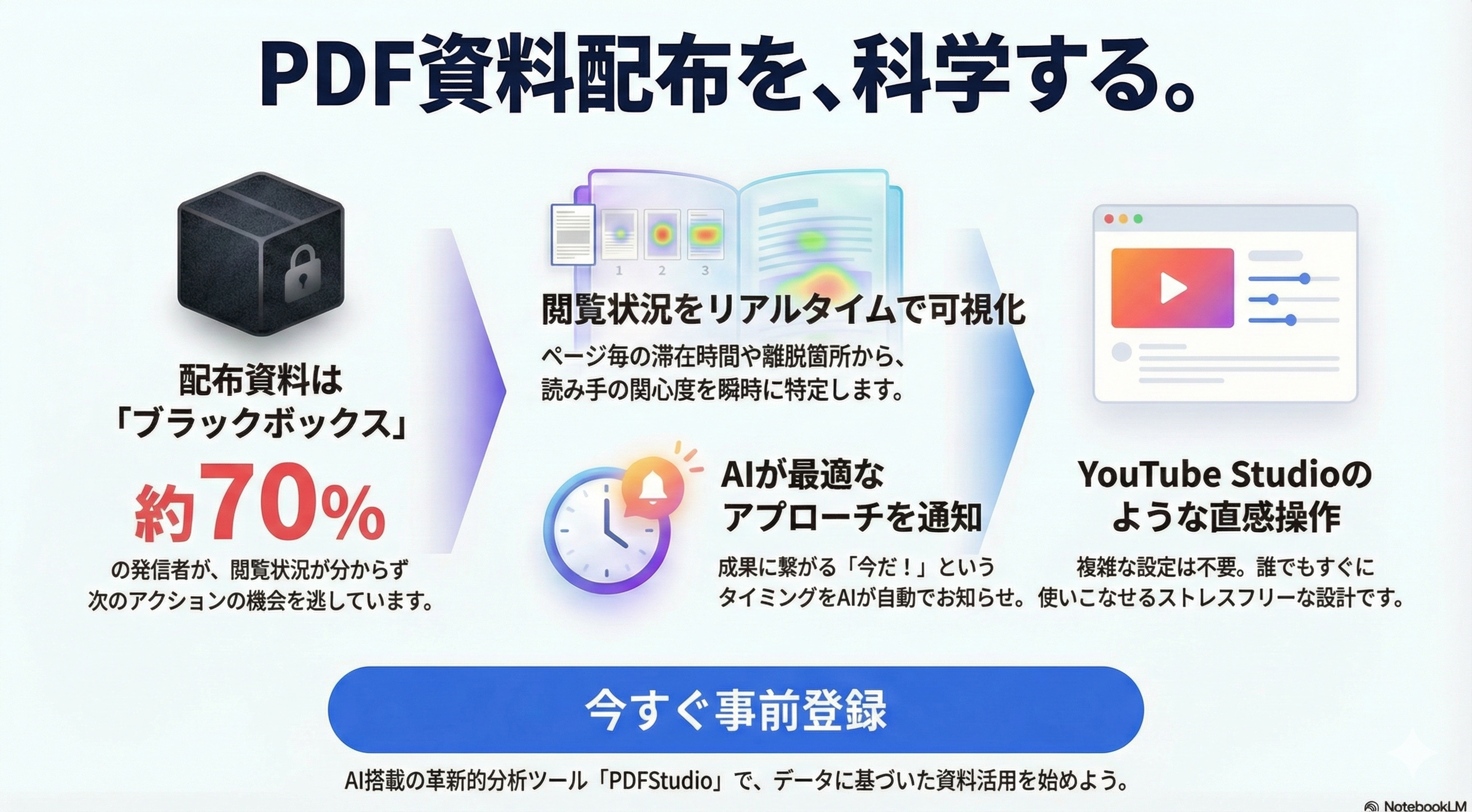合同会社FYBE.jpは、本日よりAIを活用したPDF資料分析ツール「PDFStudio」の事前登録受付を開始いたします。本ツールは、資料配布後の「閲覧者の行動」を可視化し、データに基づいた攻めの営業を実現する次世代のカスタマーサクセスツールです。
