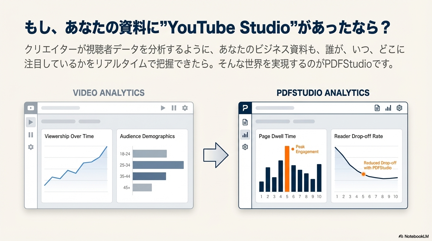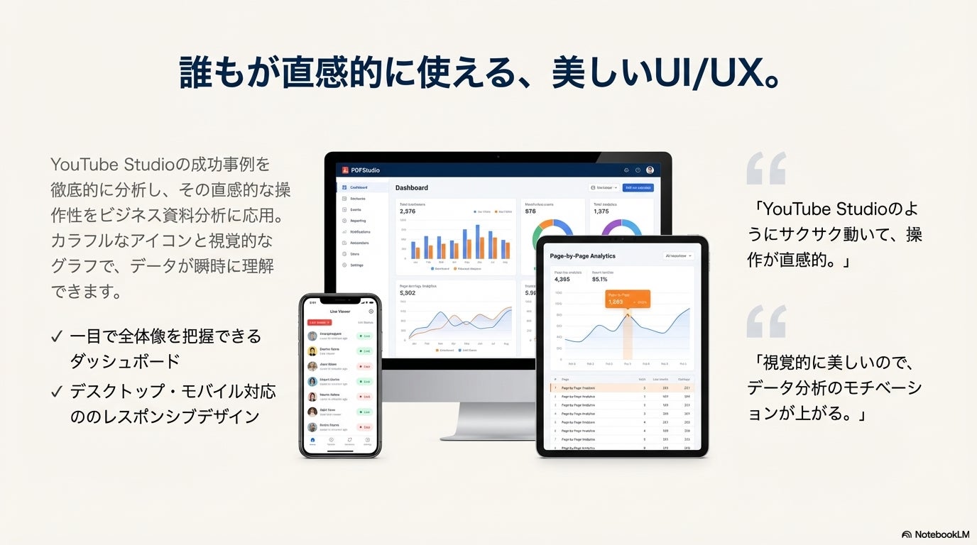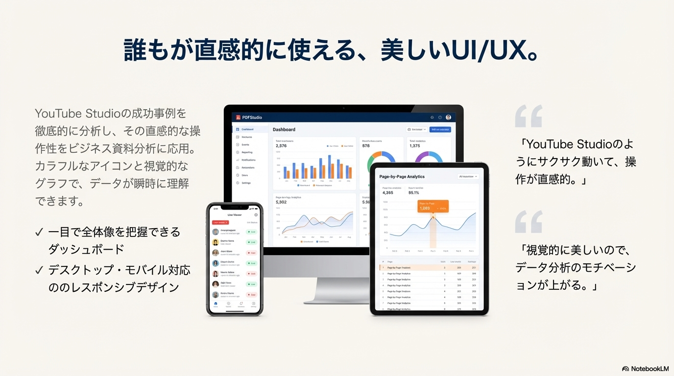 PDFStudioの最大の特徴は、世界中のクリエイターが愛用するYouTube Studioの設計思想をUI/UXに取り入れている点です。