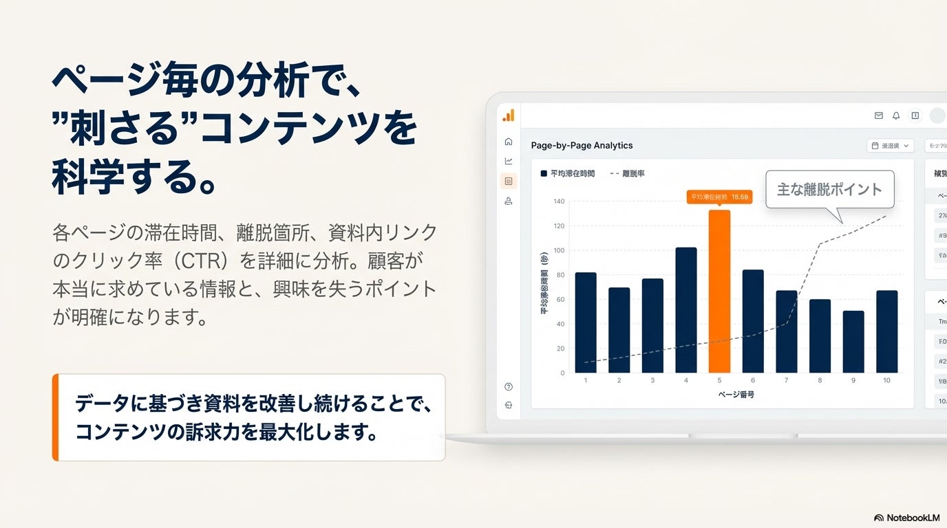 離脱箇所やクリックされたボタンを評価。資料の改善点を即座に発見。