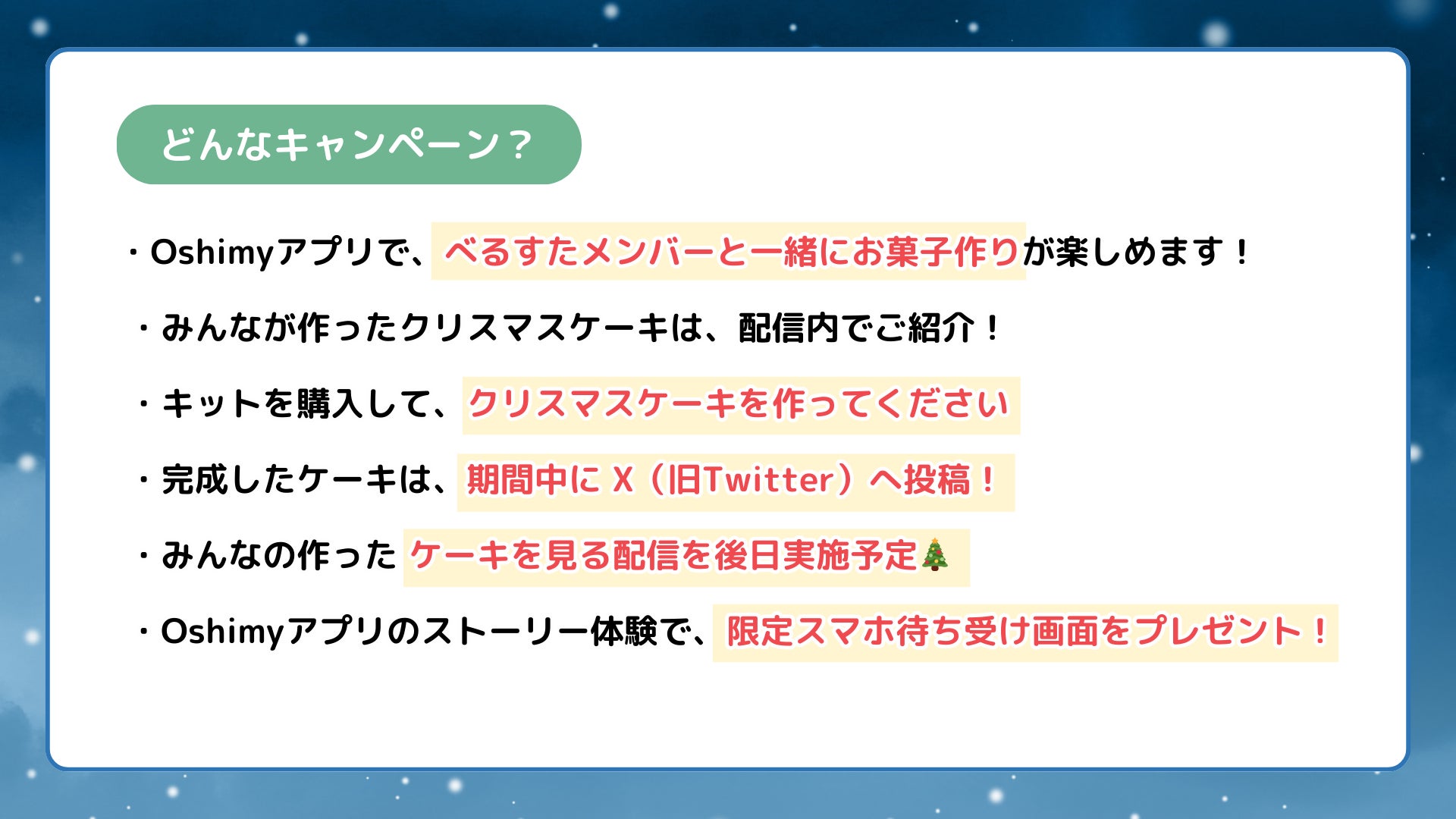 Oshimyアプリ連動!べるすたのメンバーと一緒にクリスマスケーキ作りが楽しめる特別コラボセットが登場