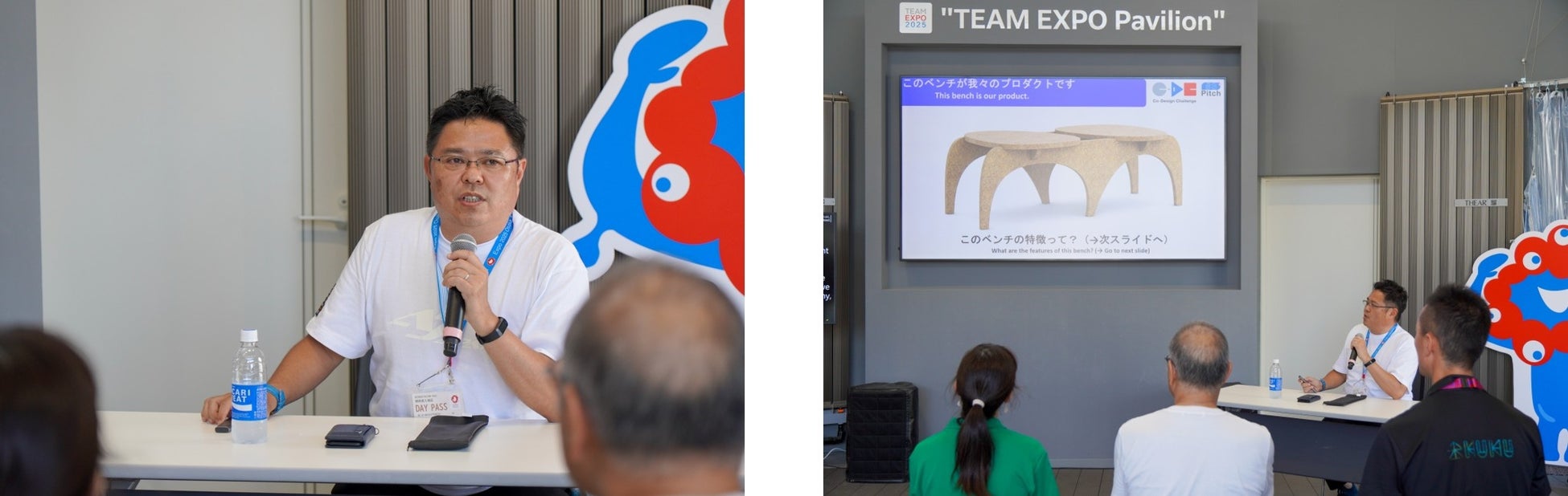ナビゲーターには、EXPO共創プログラムディレクター・齋藤精一氏と山出淳也氏を迎え、エースジャパン株式会社、テラサイクルジャパン合同会社、旭川家具工業協同組合、株式会社折兼、一般社団法人Design Week Kyoto 実行委員会の5事業者が登壇。それぞれが直面する社会課題や、それに応えるために開発したプロダクト、さらに万博終了後を見据えた展望について発表しました。
