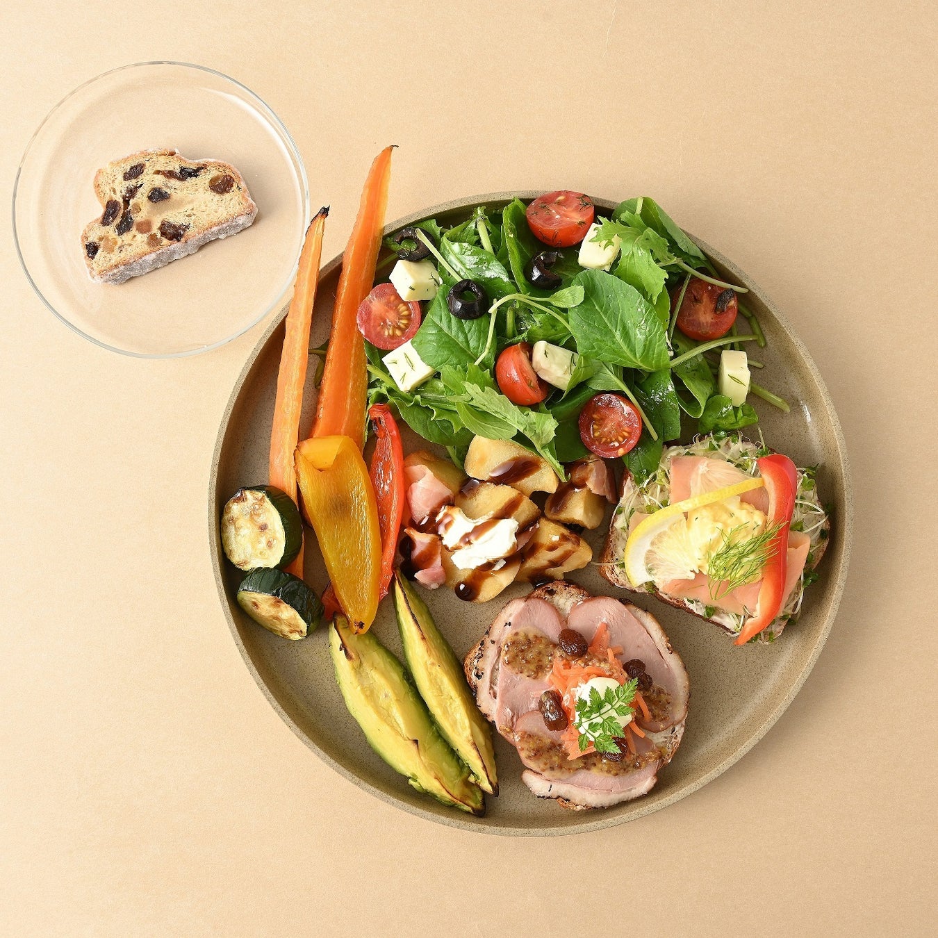 サーモンと合鴨を使用した、この時期だけの華やかなスメアブロプレート。トマトの赤とリーフのグリーンのクリスマスカラーで仕立てた彩り豊かなサラダ、グリル野菜に加え、クリスマスの伝統菓子であるシュトレンをデザートに添えました。特別なクリスマスランチにぴったりです。