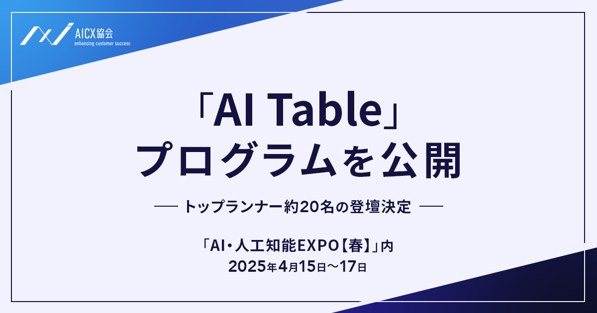 生成AI技術を活用したAIエージェントの社会実装を推進し、顧客体験(CX)の変革を目指す一般社団法人AICX(AI Customer Experience)協会(東京都、代表理事:小栗伸、小澤健祐、以下、AICX協会)は、2025年4月15日(火)~17日(木)に東京ビッグサイトで開催される「AI・人工知能EXPO【春】」内にて、特別企画「AI Table」を主催します。