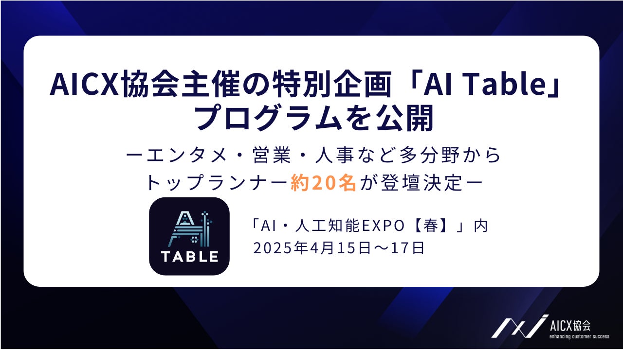 生成AI技術を活用したAIエージェントの社会実装を推進し、顧客体験(CX)の変革を目指す一般社団法人AICX(AI Customer Experience)協会(東京都、代表理事:小栗伸、小澤健祐、以下、AICX協会)は、2025年4月15日(火)~17日(木)に東京ビッグサイトで開催される「AI・人工知能EXPO【春】」内にて、特別企画「AI Table」を主催にあたり、登壇プログラムおよび登壇者情報を公開しました。