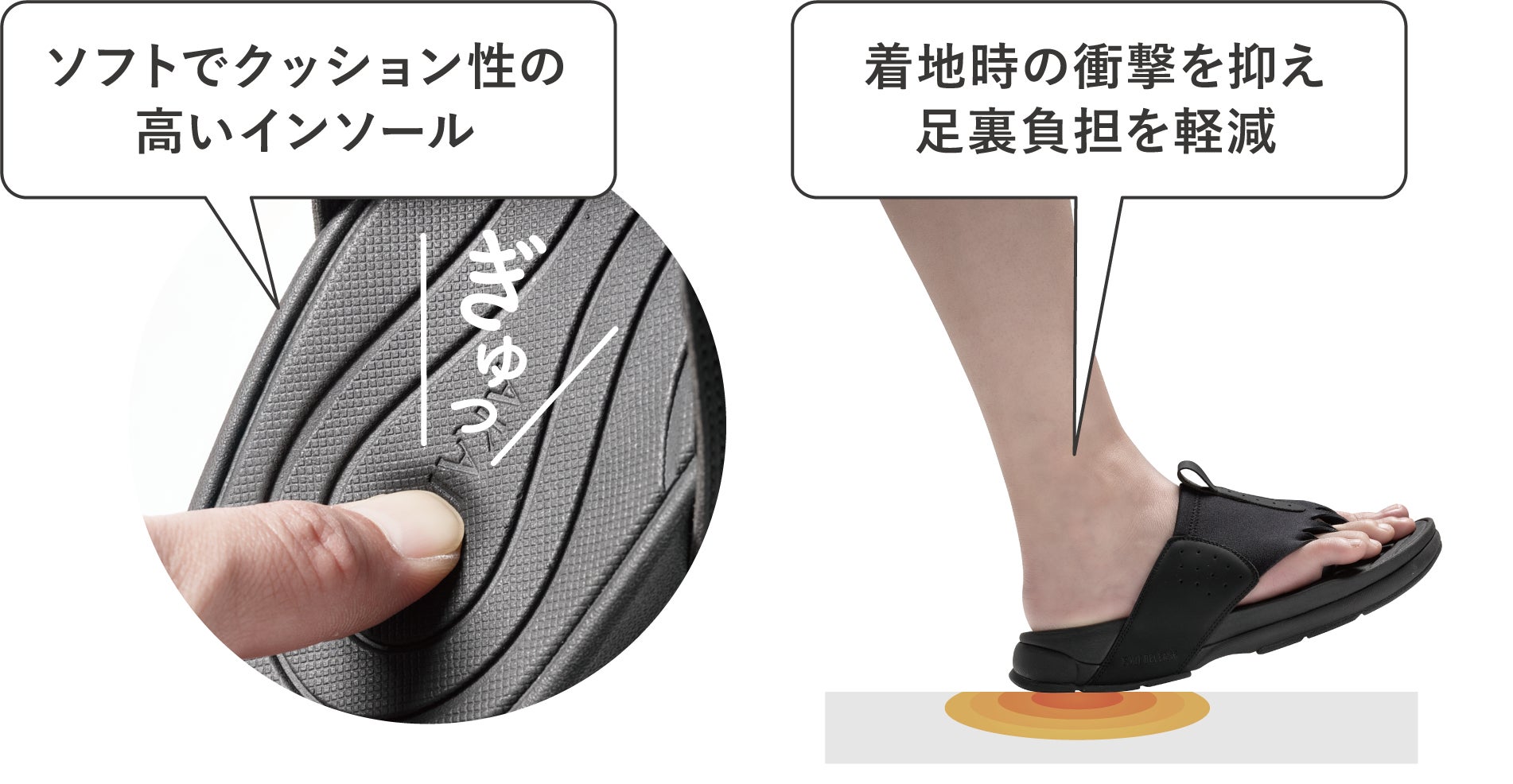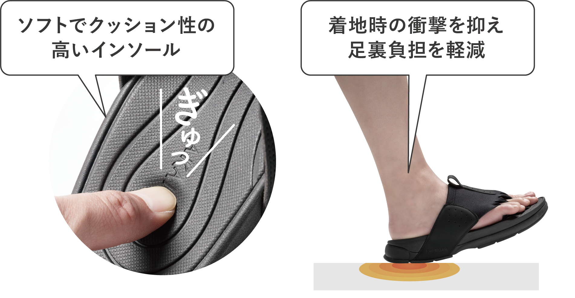 柔らかくクッション性の高いインソールが着地の衝撃を軽減。着地時の衝撃を抑え足裏負担を軽減します。