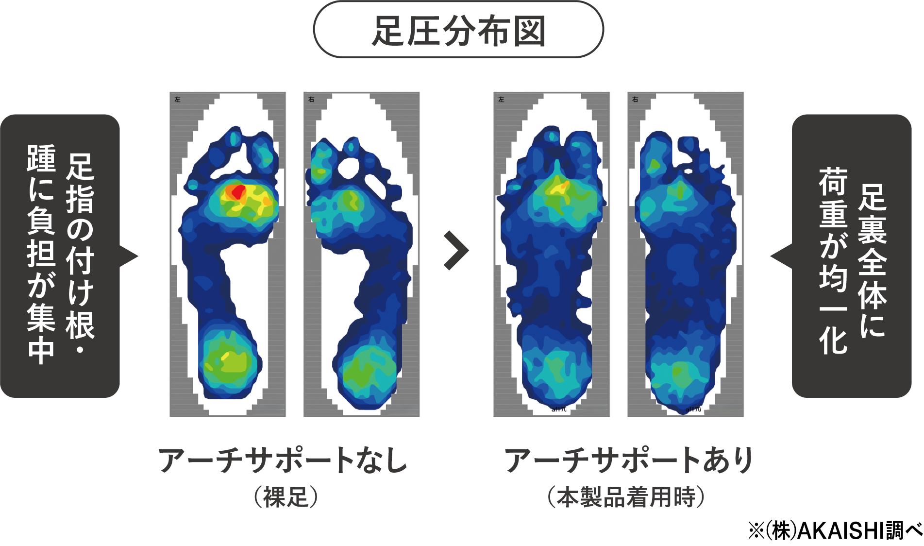 足裏の凹凸カーブに沿うフットベッドが足のアーチをサポート。足裏全体を支えて負担を分散します。