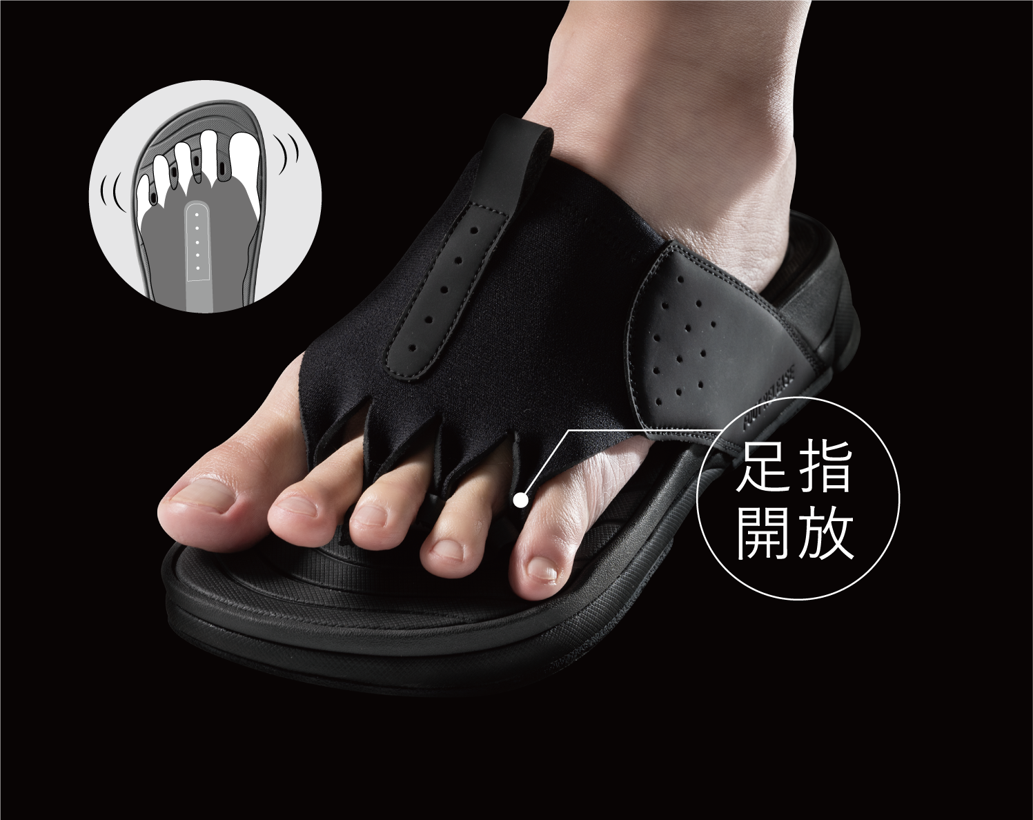 日常で酷使しがちな足指を広げてリラックスし、足裏を優しくサポートするこだわりのリカバリーサンダルです。