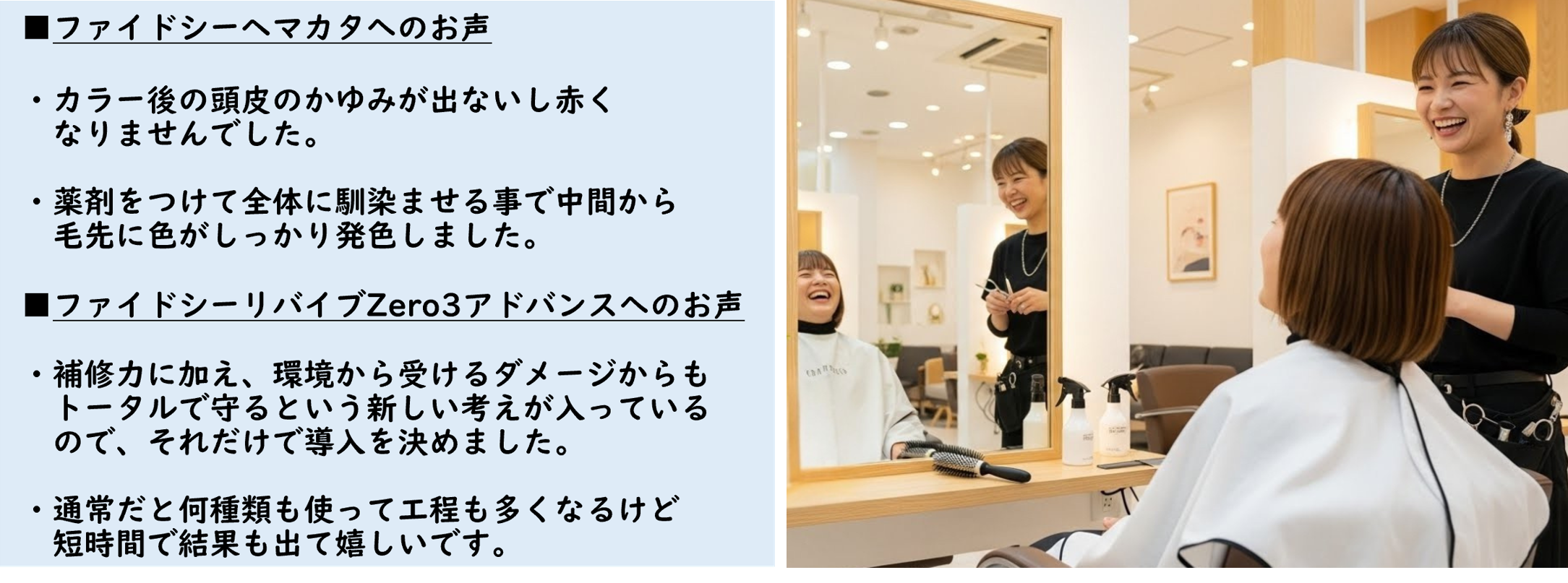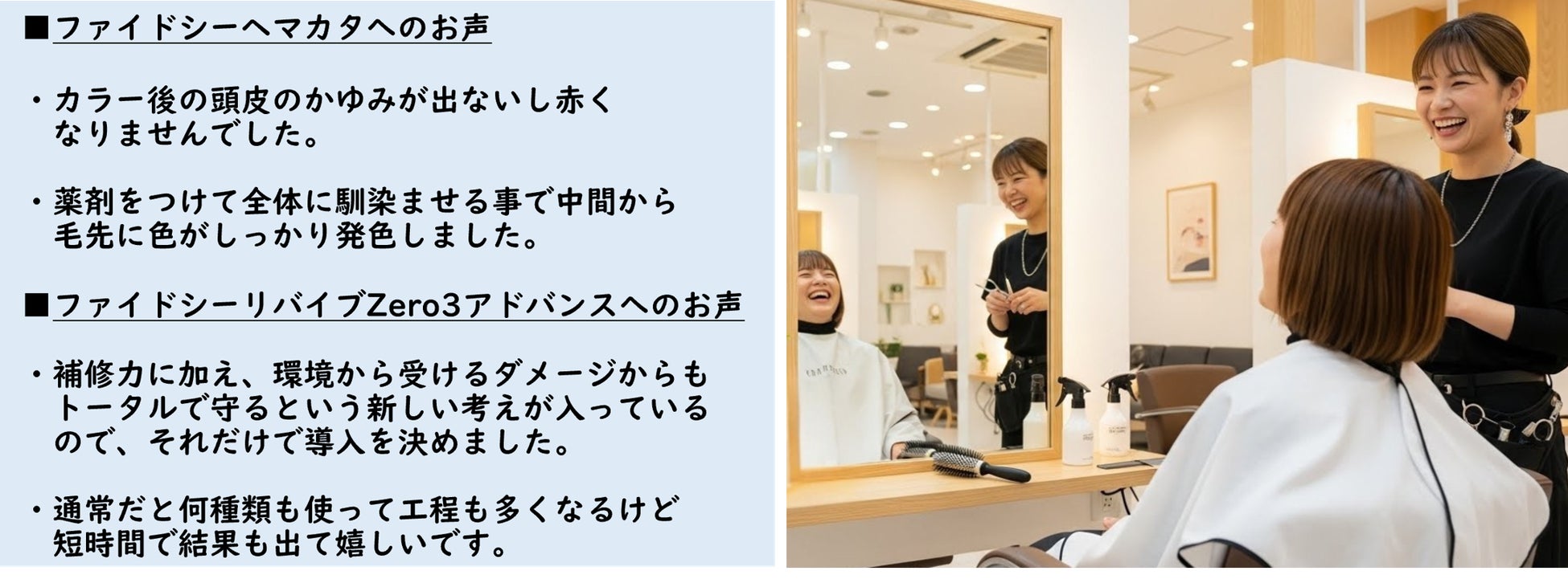ドゥアクシュはこれまで、美しい髪から生まれる「笑顔の似合う髪へ」という想いを起点に、商品開発を行ってきました。商品のリニューアルに際し、理美容師様のお声や現場から寄せられたリアルな声を商品開発に反映させて「髪を守りながら整える」というコンセプトの基に進め、商品をテストいただいた理美容室様から下記のお声をいただいております。