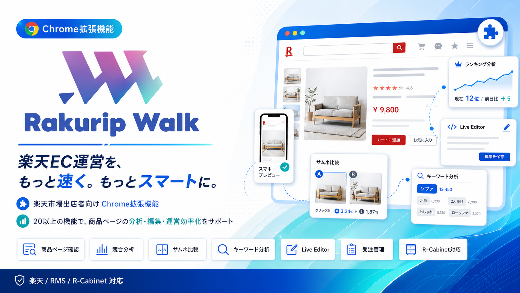 ラクリプウォークは、楽天市場の商品ページ確認、RMSでの商品編集、R-Cabinetでの画像管理、受注管理、競合分析、ランキング確認など、EC運営で日々発生する作業をブラウザ上で効率化するChrome拡張機能です。