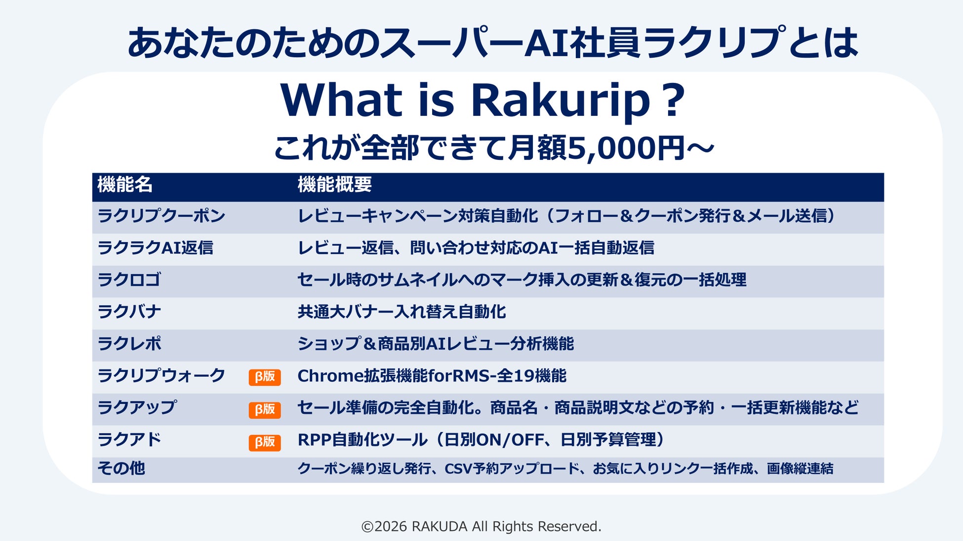 月額料金には、ラクリプウォークのほか、「ラクラクAIレビュー返信」「ラクレポ」「ラクリプクーポン」「ラクロゴ」「ラクバナ」を含む画像関連機能、レビュー対策、クーポン運用、共通大バナー自動管理、各種業務自動化など、ラクリプが提供するすべての既存機能※が含まれています。