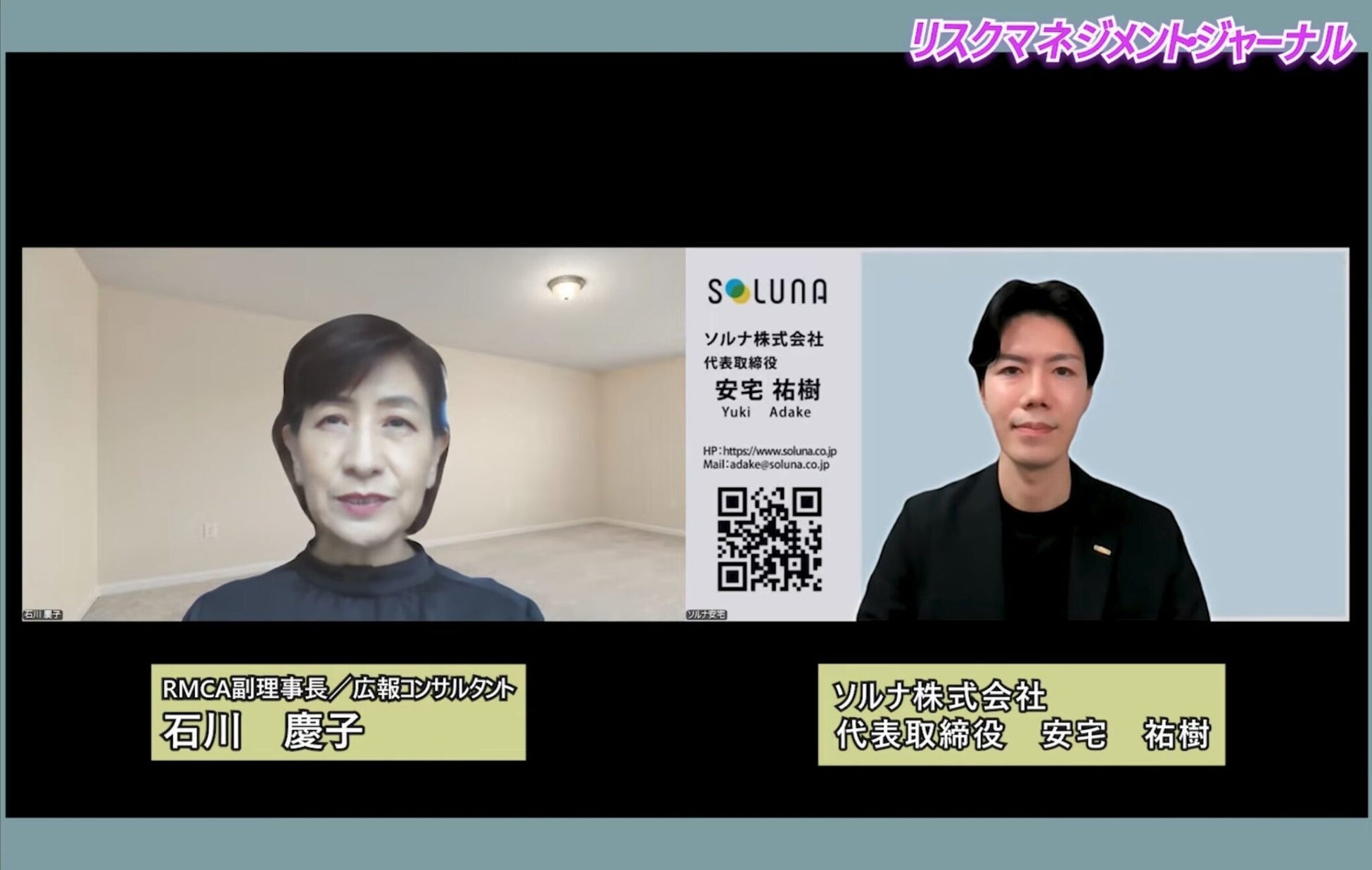 ソルナ株式会社(本社:東京都中央区、代表取締役:安宅 祐樹)は、一般社団法人リスクマネジメント協会(RMCA)副理事との対談をYouTubeで公開しました。