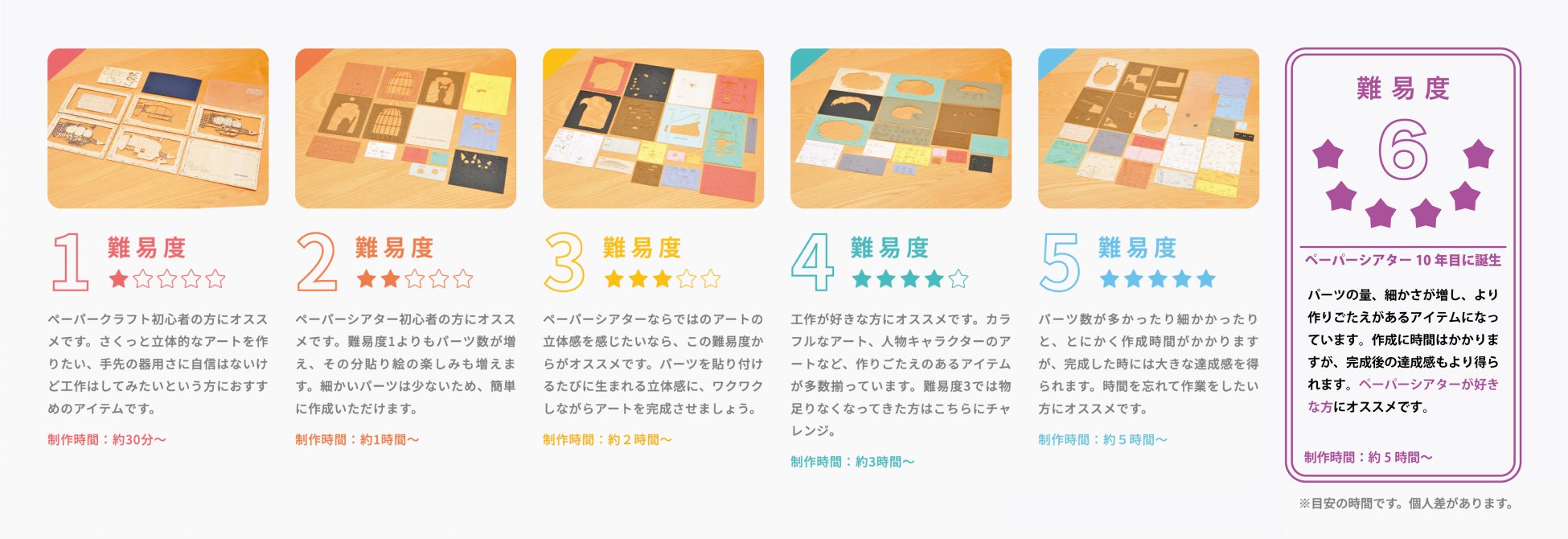 ペーパーシアターはこれまで、ペーパークラフト初心者の方から時間を忘れて制作に没頭したい上級者の方まで幅広い方々に楽しんでいただけるよう、各商品に1〜5までの5段階の制作難易度が設けられていましたが、この10周年を機に、最高制作難易度を更新します。