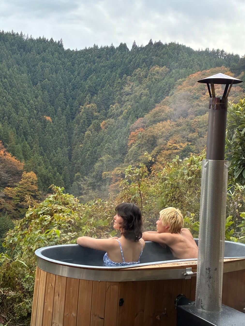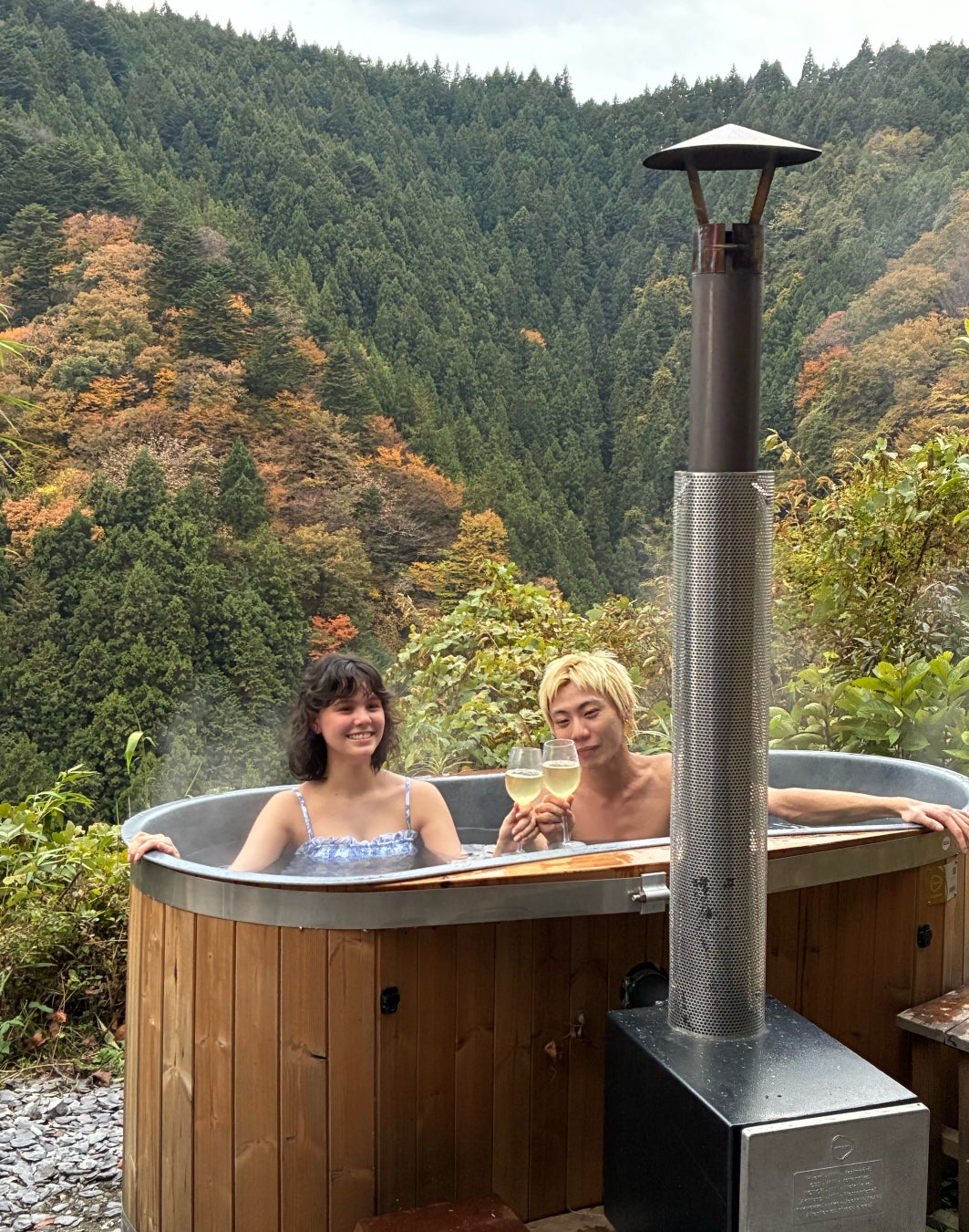 湯気が立ちのぼる薪風呂の中で、 シャンパンのグラスを手に、静かに乾杯するひととき。周囲には人工物が一切なく、視界に広がるのは連なる山と森だけです。