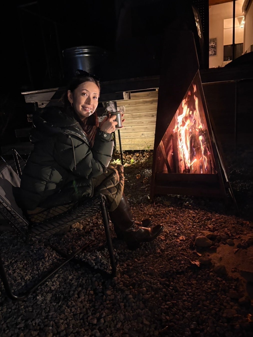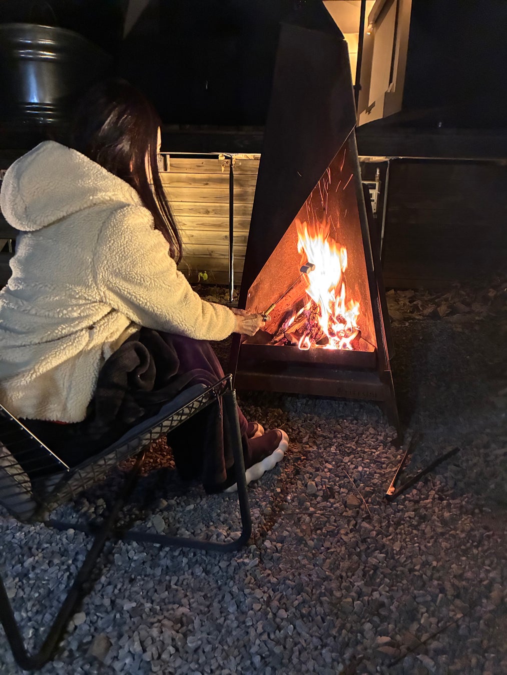 冷たい外気と、炎のぬくもりの対比が、自然と人を引き寄せます。 薪がはぜる音をBGMに、マシュマロを焼いたり、 温かいドリンクを片手に、ただ火を眺めたり。