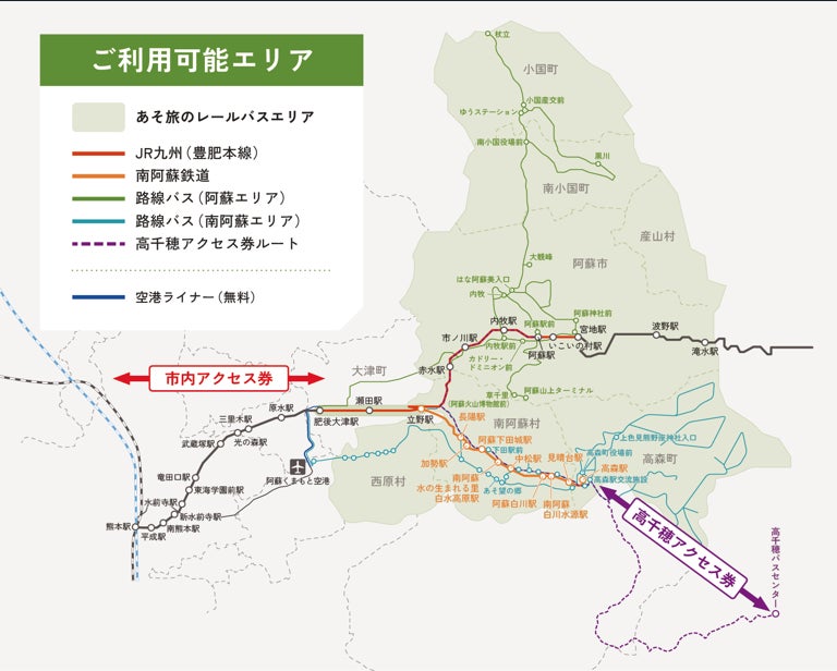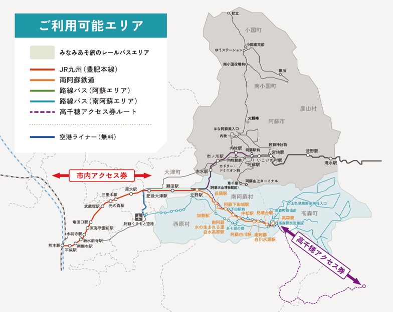 一般社団法人九州MaaS協議会会員である、南阿蘇鉄道株式会社、九州旅客鉄道株式会社、九州産交バス株式会社、産交バス株式会社の4社は、阿蘇・南阿蘇地域を1日中、公共交通機関で周遊できる※MaaSチケット「あそ旅のレールバス」・「みなみあそ旅のレールバス」に、高千穂へのアクセスをさらに便利にする「高千穂アクセス券」をセットにした新たなチケットを発売します。