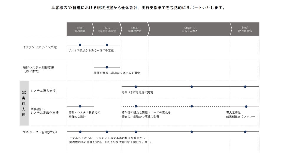 「コンサルティング」「課題設計」「システム開発」を包括的にサポートします。現状調査・計画策定・業務設計から、システム導入・運用までのステップを全てカバーし、お客様の課題・業務効率化・IT環境・予算状況などを踏まえて、最適なマネジメントプランの設計・提供をご支援します。