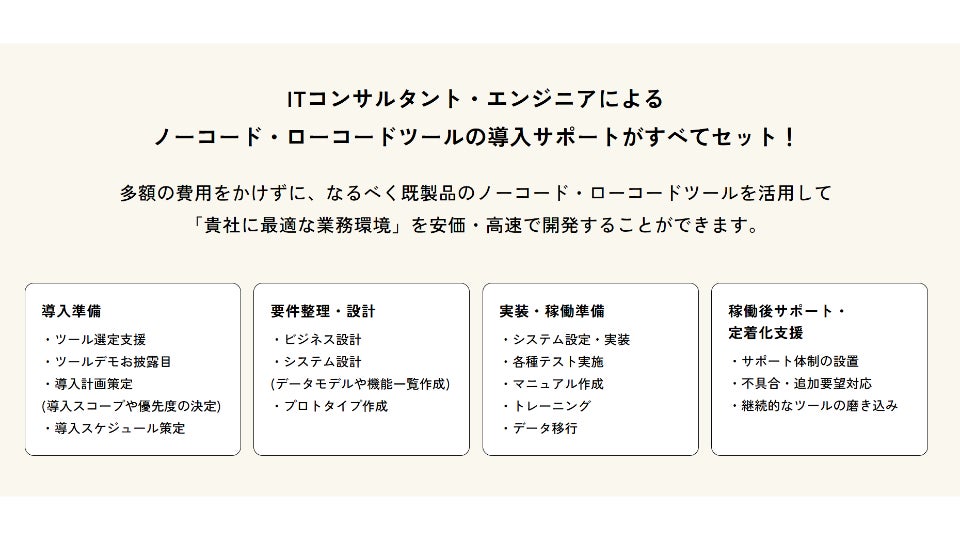 「ちょっとずつ、ちょうどいいデジタル化。」をコンセプトに、DXアドバイザリー、ノーコード・ローコード開発、クラウド導入支援サービスを提供。