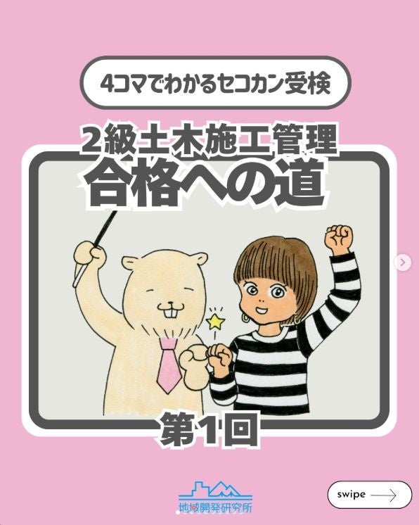 施工管理技術検定受検者向け参考書の出版や受検対策講習会の運営を手がけている一般財団法人 地域開発研究所(東京・文京区/理事長:青柳一郎)は2025年3月、公式instagramアカウントを開設しました。約46年間、施工管理技士の受検対策事業に携わっているノウハウを生かし、建設業界や施工管理技士の基礎知識を教える「初めての人でもわかる」シリーズ、施工管理技術検定の受検対策をマンガで紹介する「4コマでわかるセコカン受検」、独特の「コトバ」から建設の世界への関心を深めていく「種目クイズ」(仮題)など、施工管理技士関連の複数のコンテンツを月1~2回、不定期で配信します。