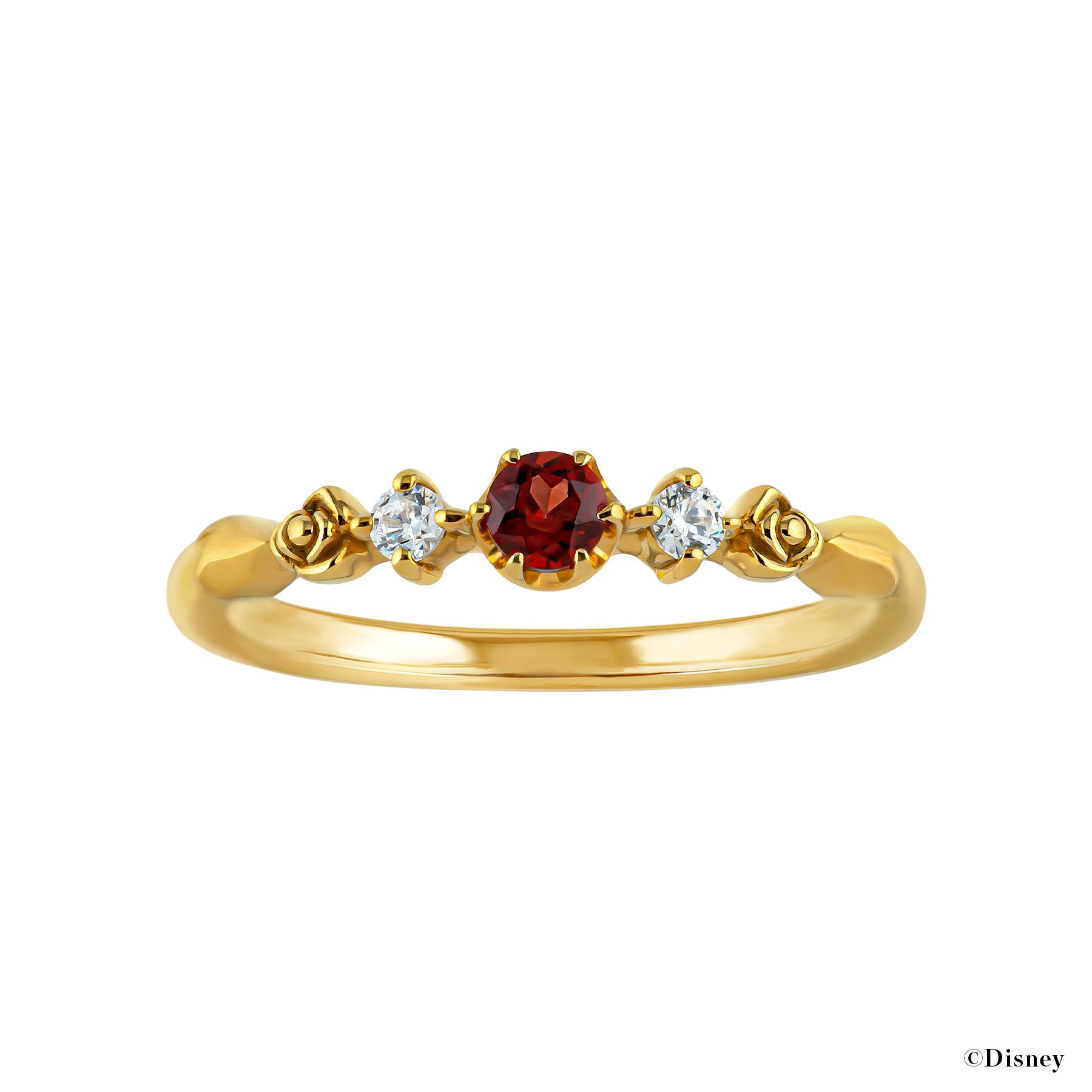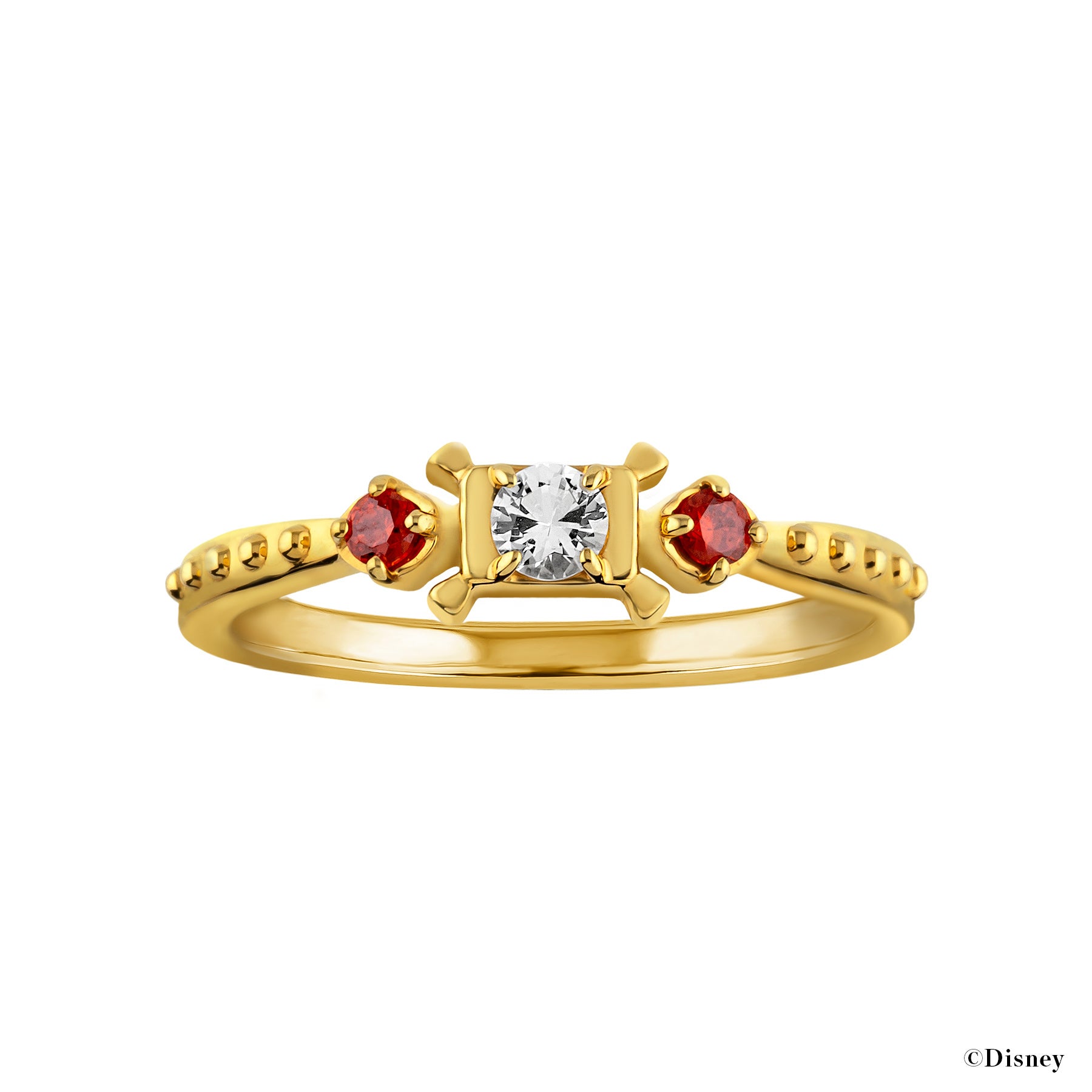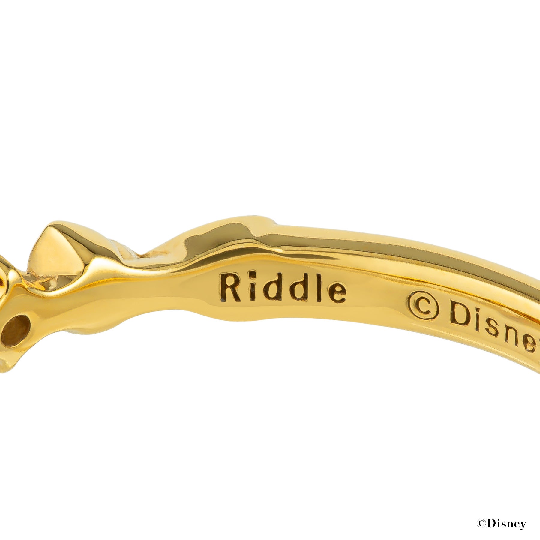 メインストーンにはガーネットを使い「リドル・ローズハート」の髪色を表現し、サイドから見ると女王の王冠をイメージした石枠にしています。脇石には衣装のカラーをイメージしたクリアカラーのキュービックジルコニアを留め、リドルらしい色合いに仕上げ、アームには女王のハートと薔薇モチーフを添えました。裏面にキャラクター名を刻印し、しっかりとリドルの雰囲気が感じられつつ、さりげないデザインでデイリー使いしやすいリングになっています。