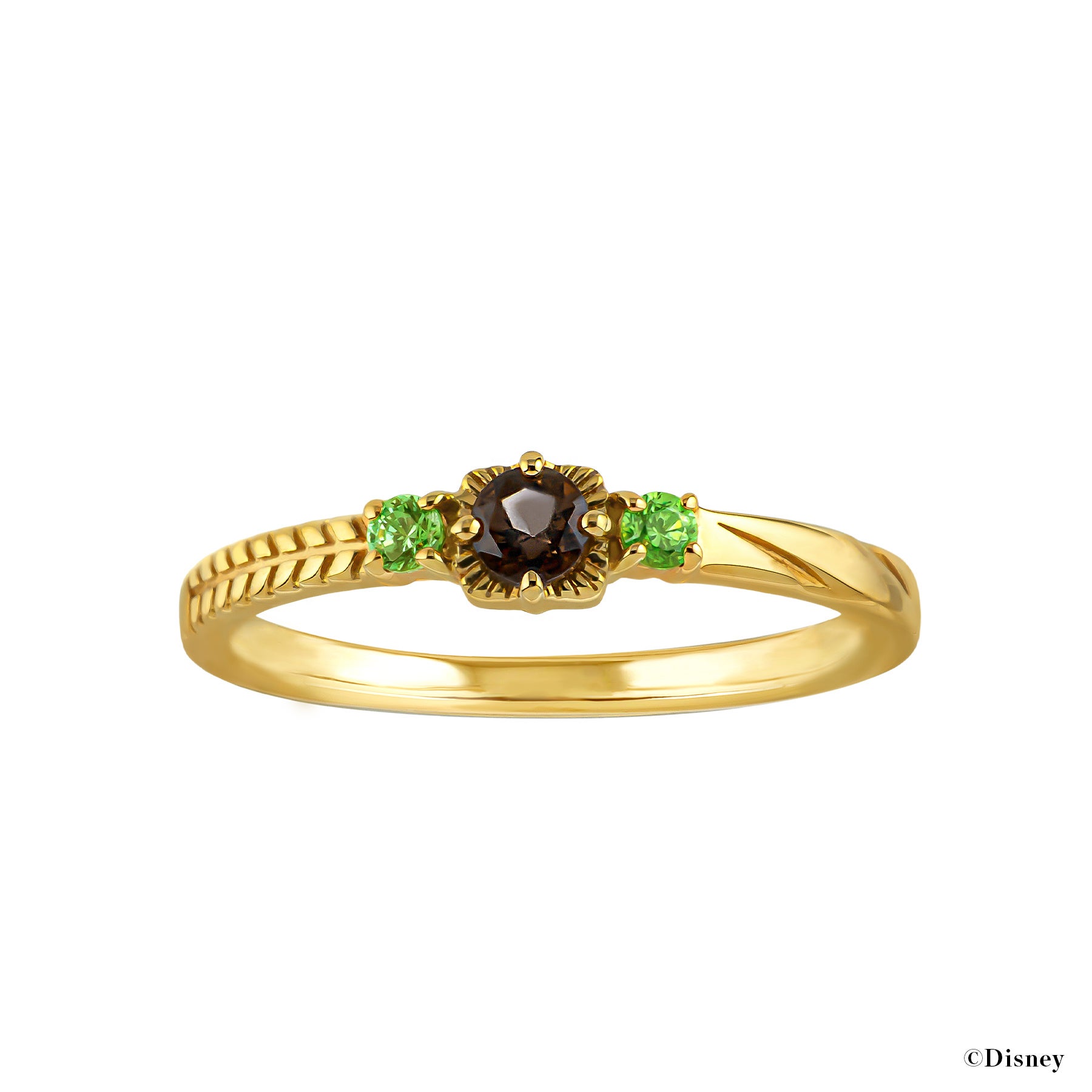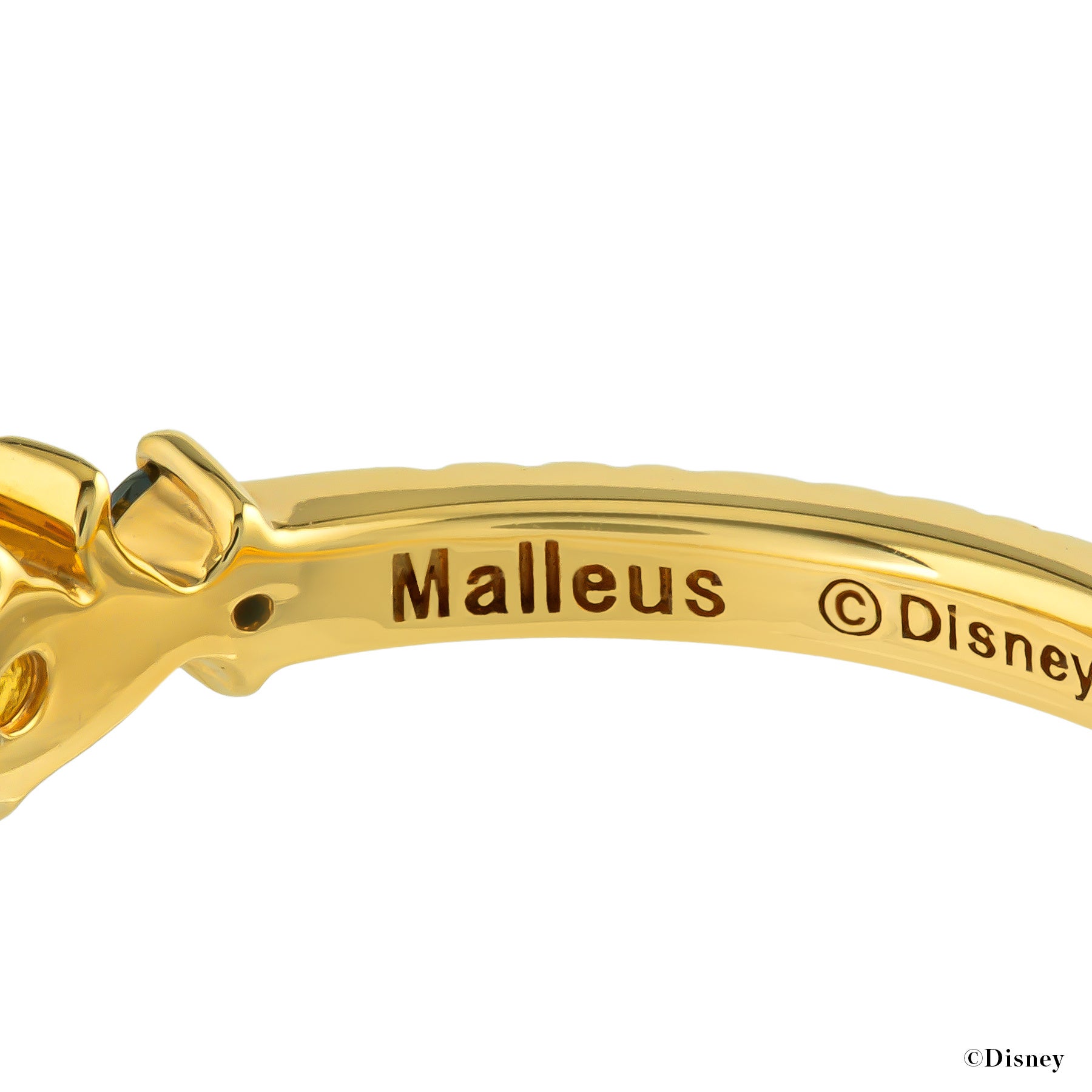 メインストーンにはペリドットを使い「マレウス・ドラコニア」の瞳や衣装の色を表現し、ドラゴンの角をイメージした石枠にしています。脇石には衣装のカラーをイメージしたブラックカラーのキュービックジルコニアを留め、マレウスらしい色合いに仕上げ、アームは糸巻をイメージしました。裏面にキャラクター名を刻印し、しっかりとマレウスの雰囲気が感じられつつ、さりげないデザインでデイリー使いしやすいリングになっています。